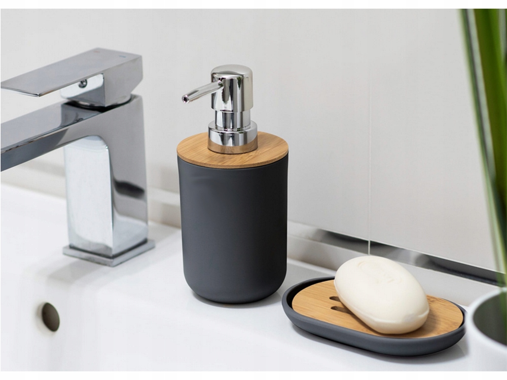 Комплект выполнен из матового черного пластика и бамбукового дерева.