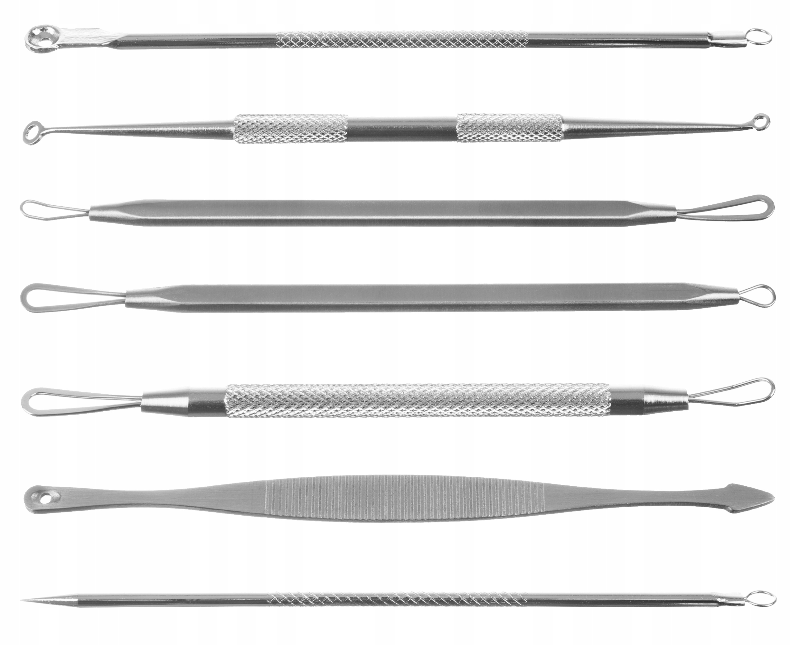 - УНИВЕРСАЛ - набор из 7 двусторонних ложечек для безопасного удаления черных точек, черных точек и прыщей. Профессиональные ложки-петли предназначены для борьбы с черными точками и другими загрязнениями на лице. Идеально подходит для удаления прыщей даже из труднодоступных мест.