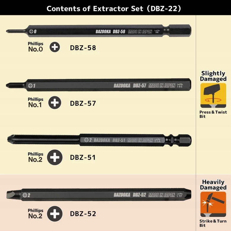 - Strike & Turn: обеспечивает дополнительную прочность более прочных винтов №2. Благодаря этому технологии, комплект ДЗ-76 справляется с самыми сложными случаями, когда требуется больше мощности и точности. Это решение гарантирует что даже самые упорные винты не станут проблемой.