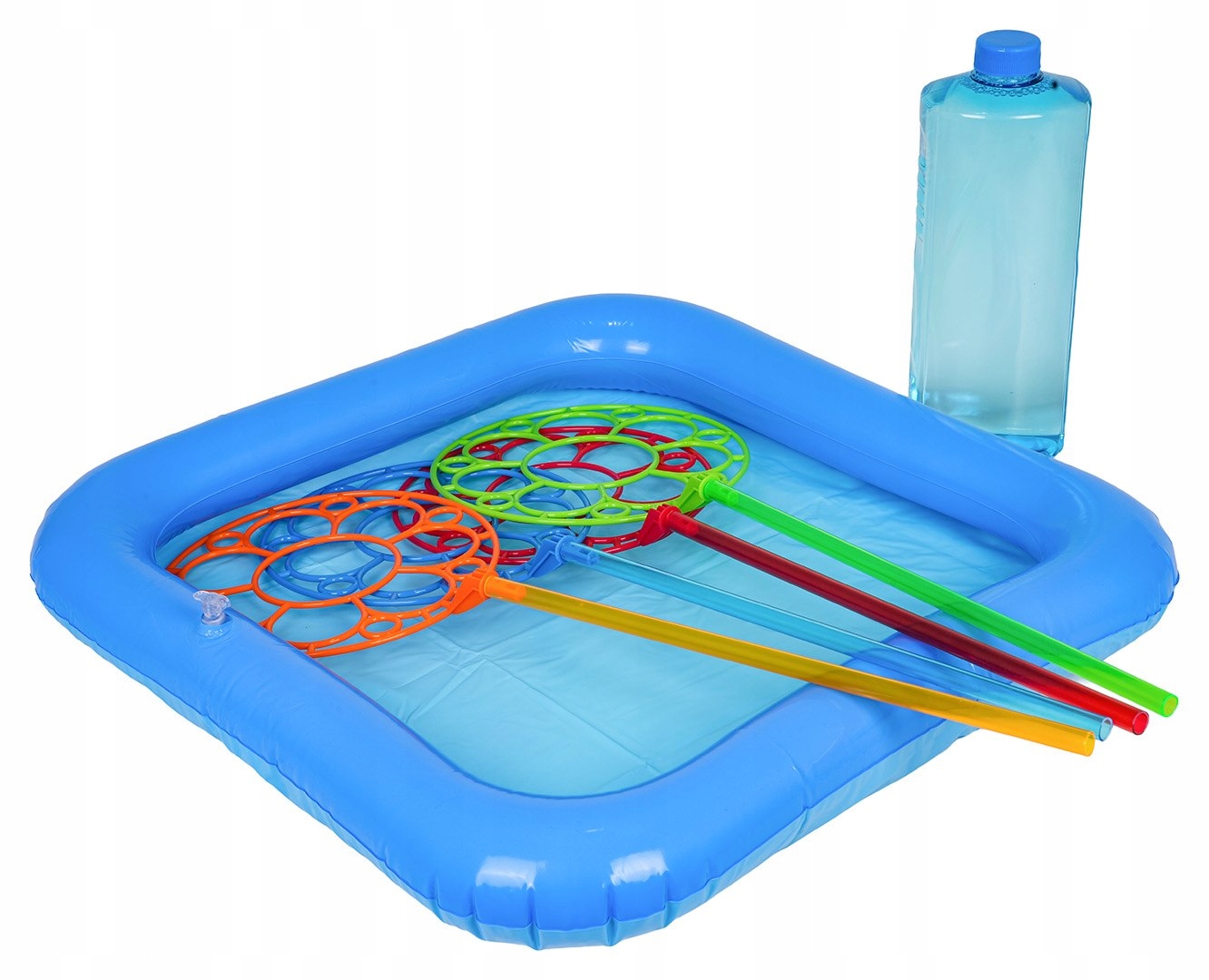 Набор для изготовления больших мыльных пузырей для детей от пяти лет. Идеально подходит для игр на свежем воздухе, прост в использовании, нравится всем детям. В комплект входят 4 разноцветных кольца для выдувания больших пузырей, бутылочка с жидкостью для каппинга и надувной бассейн для жидкости. Ребенок погружает кольцо в лужу жидкости и выдувает огромные мыльные пузыри. Набор доставляет массу удовольствия и радости.