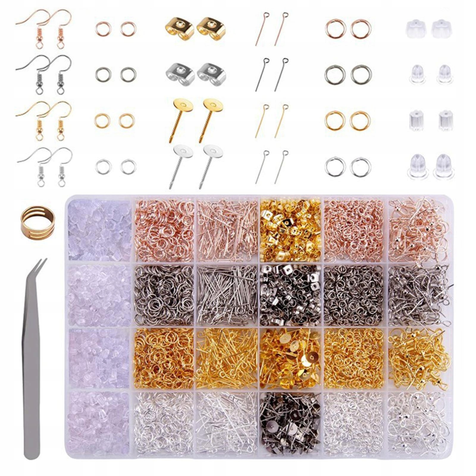 Материалы для изготовления сережек: в комплект для изготовления сережек входят 200 задних частей сережек, 1200 шт. переходных колец диаметром 4 мм, 800 шт. переходных колец диаметром 6 мм, 160 шт. крючков для сережек, 600 шт. силиконовых задних частей сережек, 400 шт. штифтов для глаз, 240 шт. опор для серег, 1 открывалка для колец, 1 пинцет.