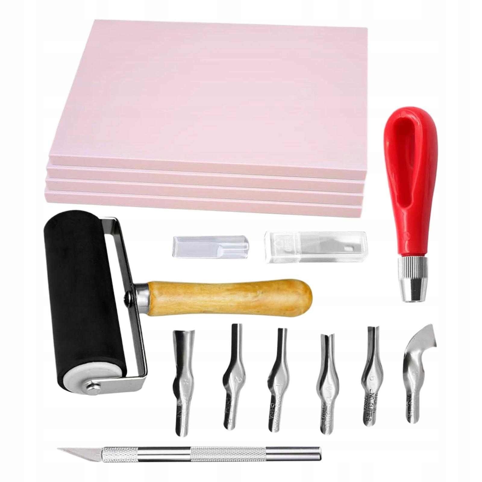 В комплект поставки входят: 4 резиновых блока, 2 набора инструментов для резьбы, 1 4-дюймовый резиновый валик Брайера