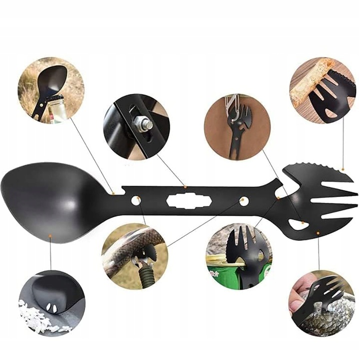 Универсальный набор столовых приборов. Многофункциональный инструмент, который будет полезен во время полевых обедов. Он изготовлен из прочного металла с антикоррозионными свойствами. На одной стороне ложка и открывалка, а на другом конце вилка, нож и консервный нож.