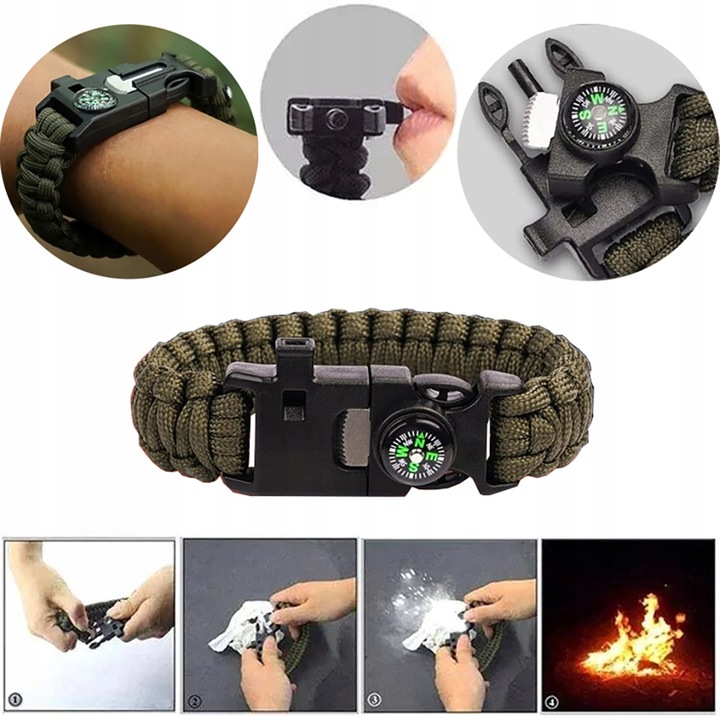 Универсальный браслет выживания с блестящим дизайном. Для его изготовления использовалась паракодовая веревка, которая при распутывании дает большой запас. Его можно использовать для постройки убежища, в качестве шнурка для обуви и для других необходимых занятий. Кроме того, в застежке находится кнопка-компас, свисток и небольшой зажигалка.