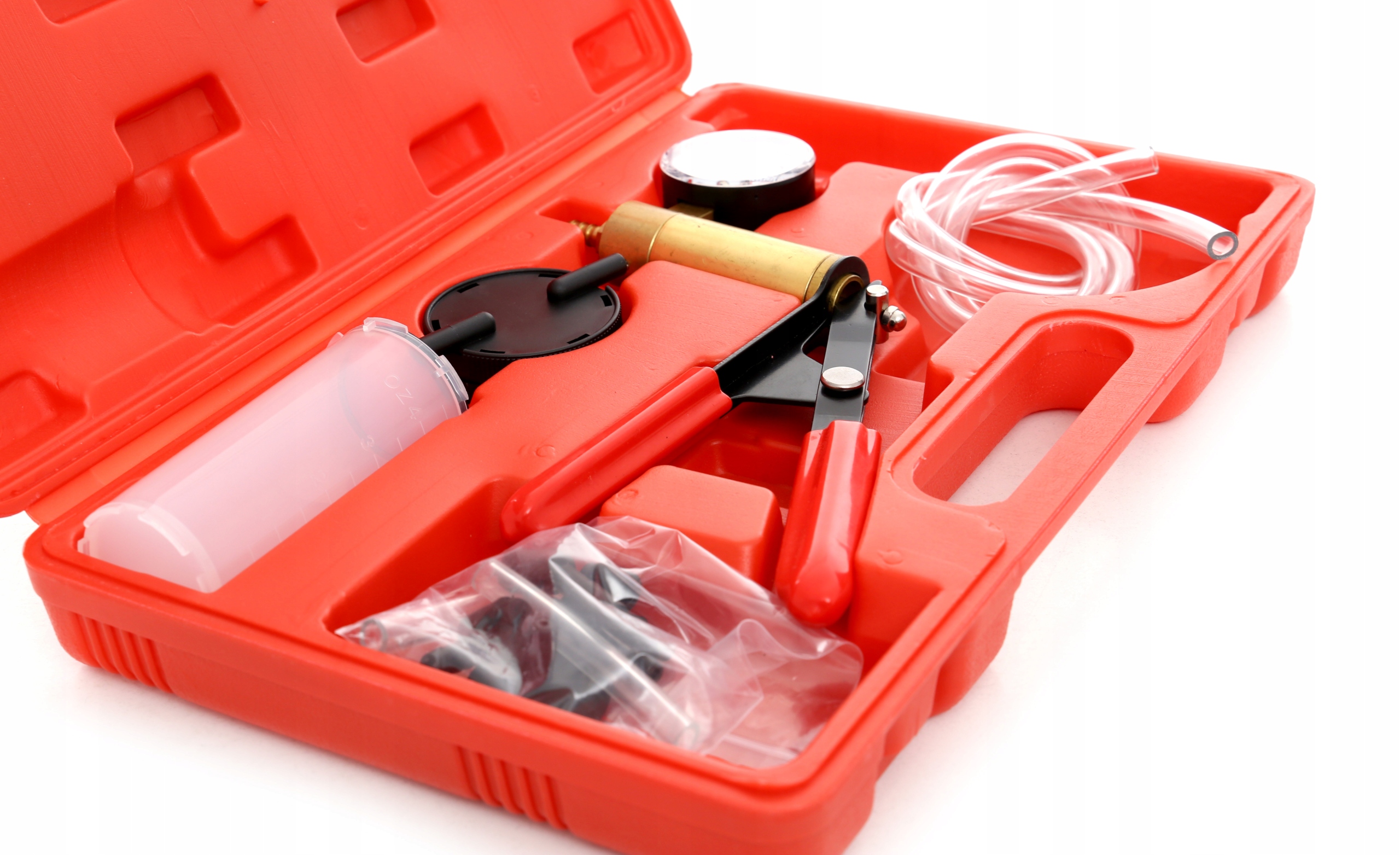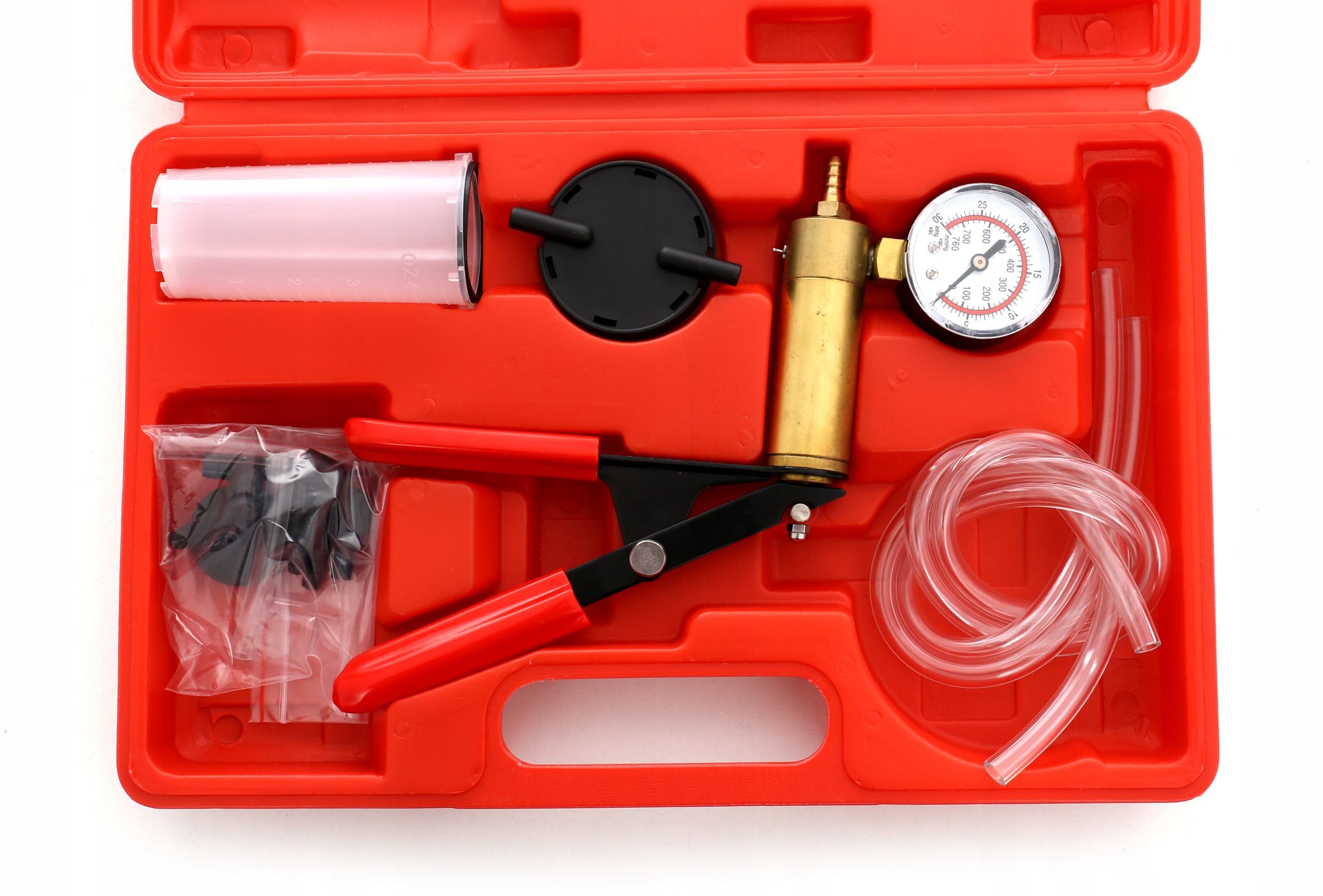 Набор позволяет проверять гидравлические детали автомобиля. Может использоваться для прокачки гидравлических систем или сифона жидкостей. Оснащен встроенным вакуумным манометром.