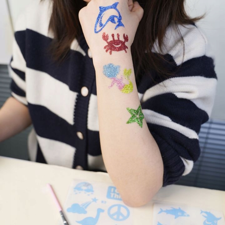 Благодаря специальному водостойкому дизайну татуировки с блестками сохраняют свой интенсивный блеск даже во время активной игры.
