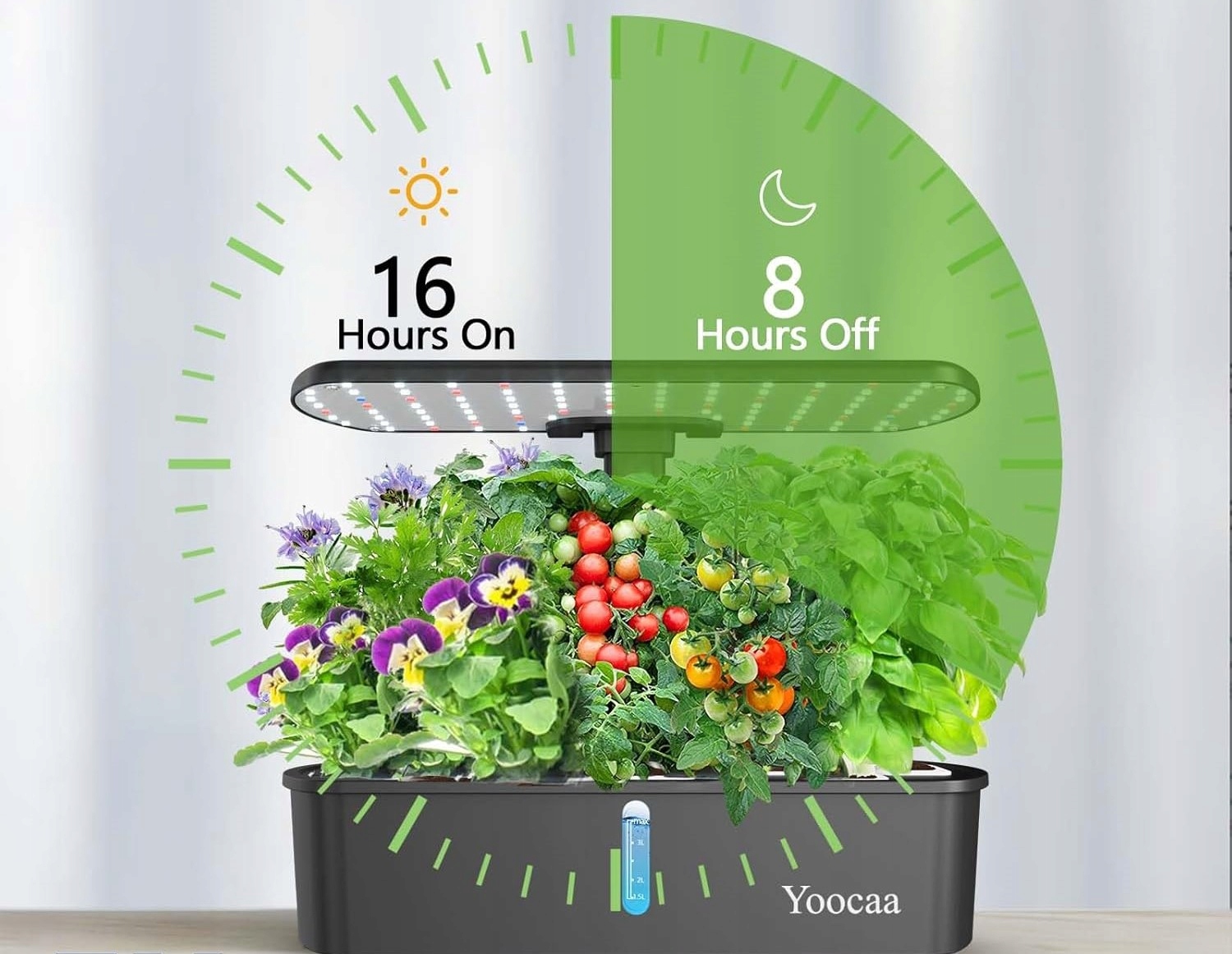 - Автоматический таймер и функция насоса: гидропонная система выращивания Yoocaa 12 оснащена 16-часовым световым таймером, который включает и выключает свет на 8 часов, а также водяным насосом с 30-минутным циклом включения/выключения. Благодаря этому производитель трав получает идеальное освещение и циркуляцию воды с минимальными усилиями, обеспечивая оптимальный рост.