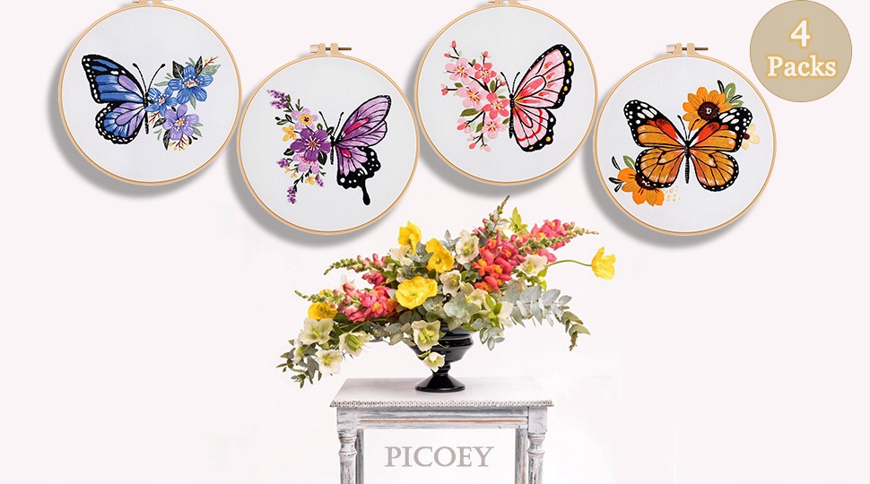 - В этом стартовом наборе для вышивания есть 4 красивых узора бабочек, которые можно повесить гостиная или спальня как украшение интерьера. Также это хороший выбор для вышивки на наволочках, полотенцах, рюкзаках, платьях.