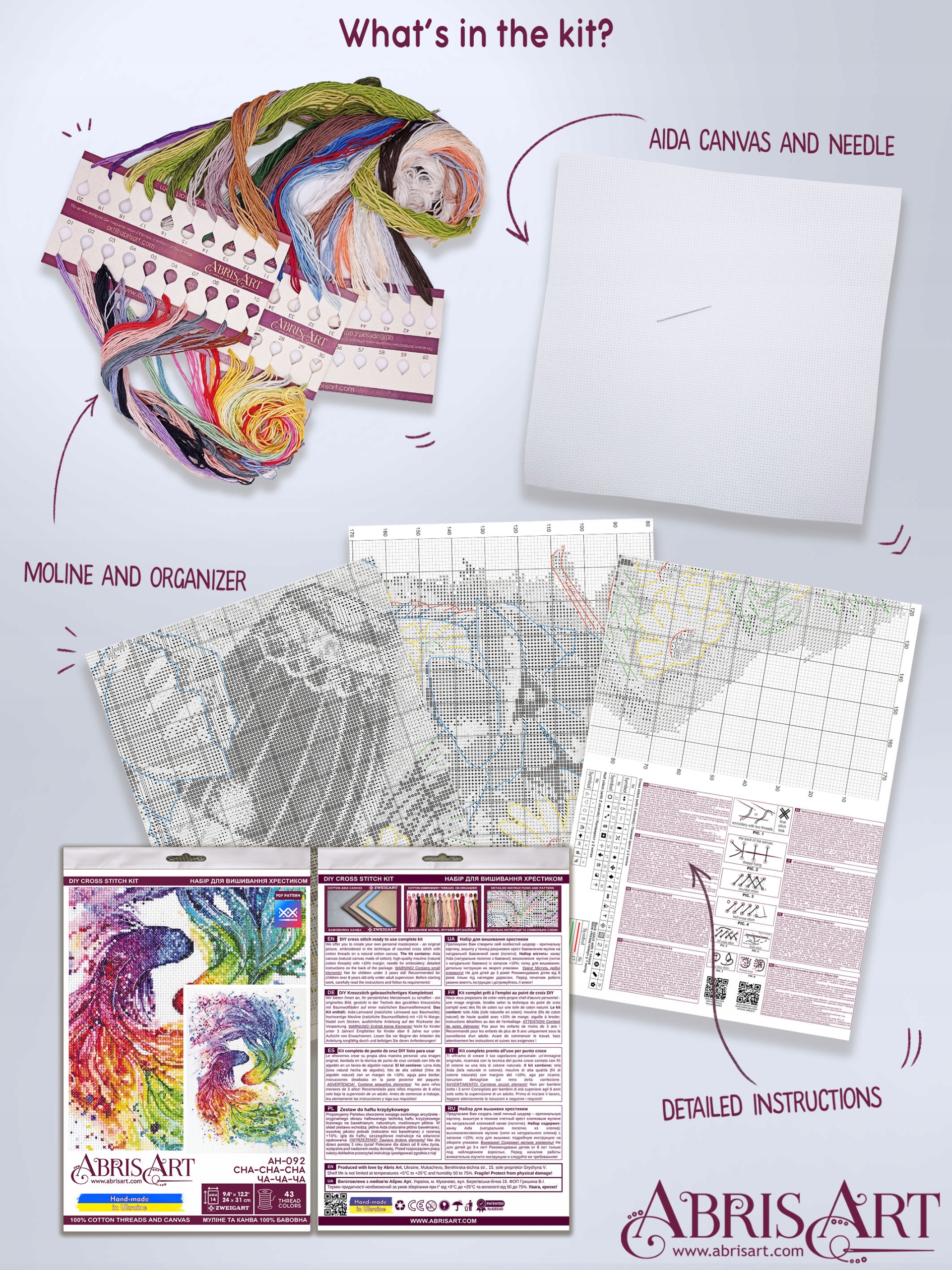 В каждый комплект входят все необходимые расходные материалы, такие как ткань для вышивания Zweigart AIDA, 100% хлопчатобумажная нить, иглы и инструкция, так что вы можете сразу приступить к работе. И все это с наценкой +10% - так что вам не придется беспокоиться о нехватке расходных материалов или поиске труднодоступных товаров.