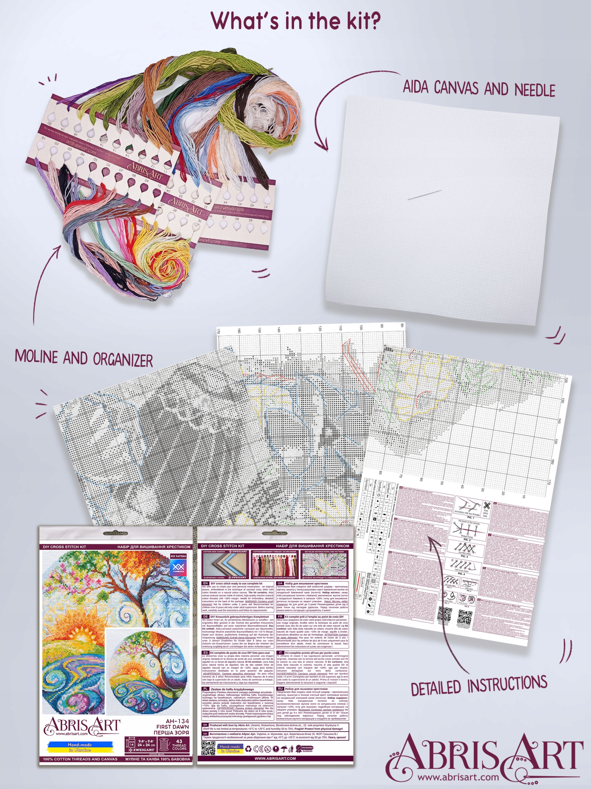 В каждый комплект входят все необходимые расходные материалы, такие как ткань для вышивания Zweigart AIDA, 100% хлопчатобумажная нить, иглы и инструкция, поэтому вы можете сразу приступить к работе. И все это с наценкой +10% - так что вам не придется беспокоиться о нехватке расходных материалов или поиске труднодоступных товаров.