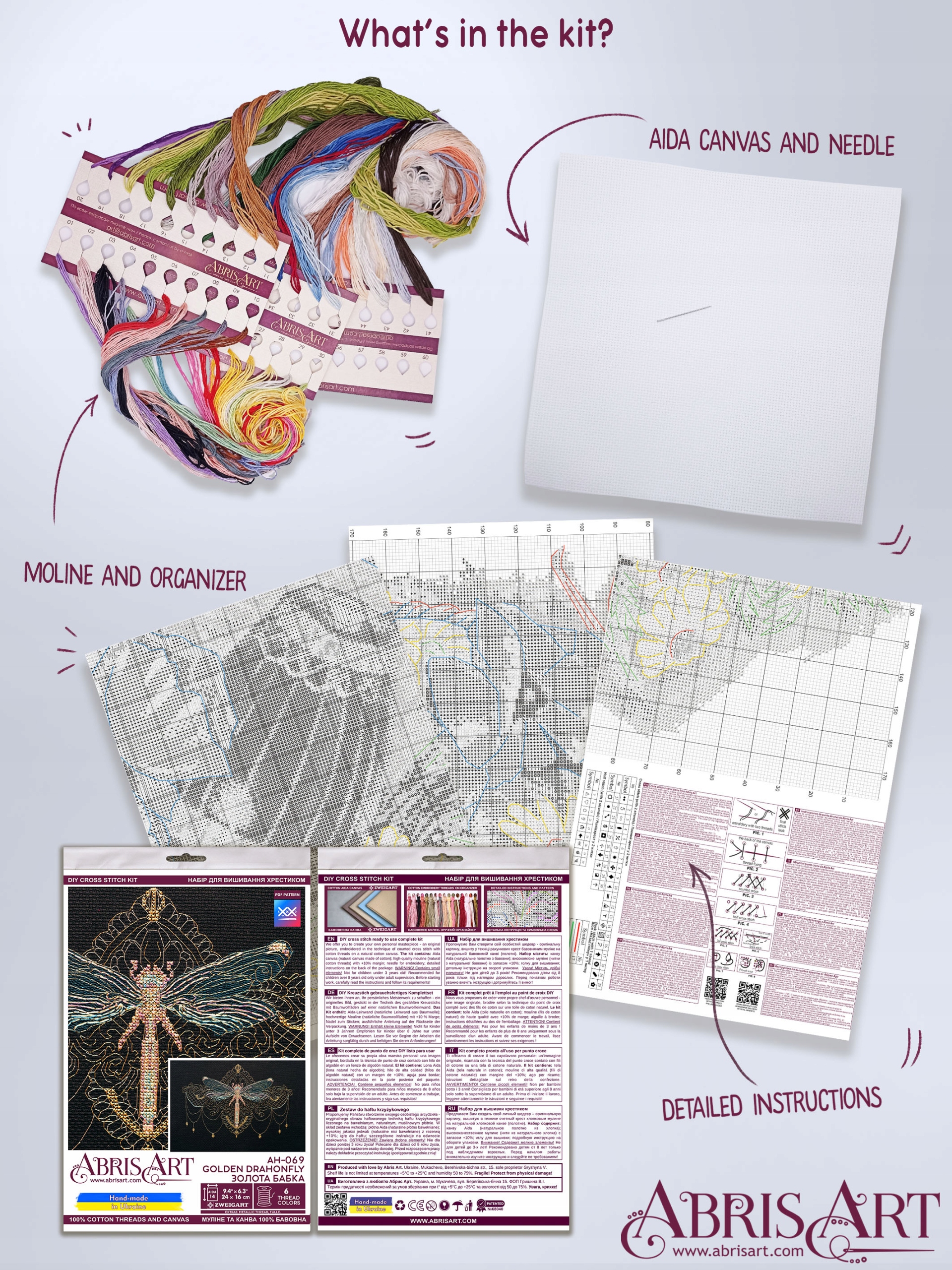 Представляем набор для вышивки крестом ручной работы «Золотая стрекоза» от Abris Art, в котором неземная красота стрекозы занимает центральное место. Этот очаровательный набор сочетает в себе изящество природы и искусство вышивки крестиком: потрясающая стрекоза тщательно вышита золотыми нитями на стильном черном фоне.