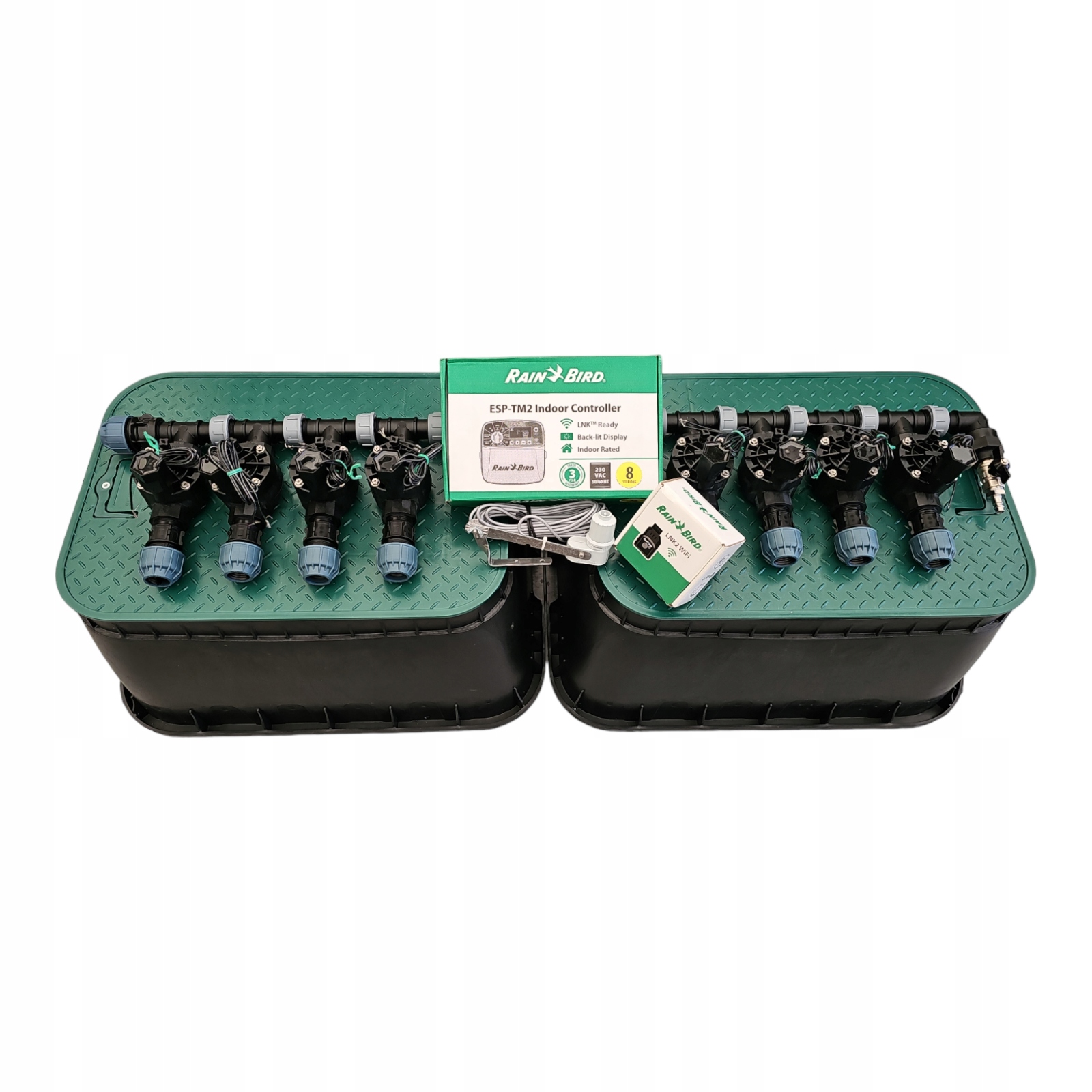 Готовый 8-секционный комплект для орошения Rain Bird с 8-секционным внутренним контроллером Rain Bird ESP-TM2 I8, WiFi-модулем Rain Bird LNK2, датчиком дождя Rain Bird RSD-BEX и 2 гигантскими колодцами Rainworks.
