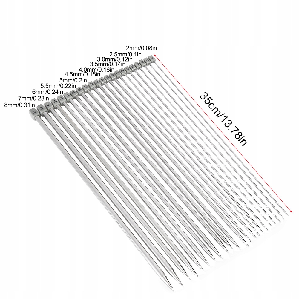 1. Одноконечные спицы длиной 35 см/13,78 дюйма. 11 разных размеров, по 2 иглы каждого размера, всего 22 штуки. Идеальный ручной инструмент для любителей вязания и тех, кто учится вязать крючком.