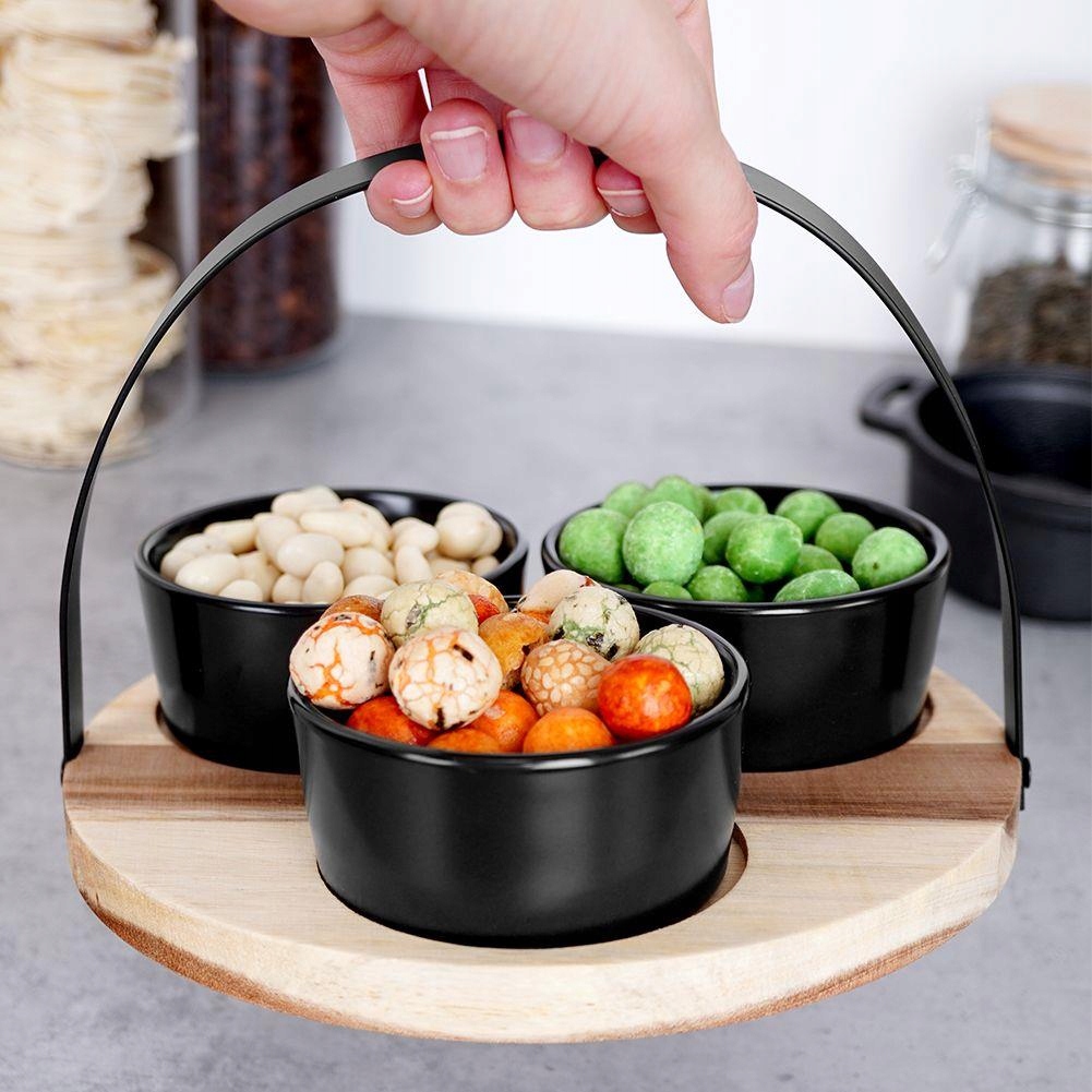 сервировочный набор из 4 предметов: керамические миски, деревянный поднос из акации и черная ручка, элегантный аксессуар для подачи закусок