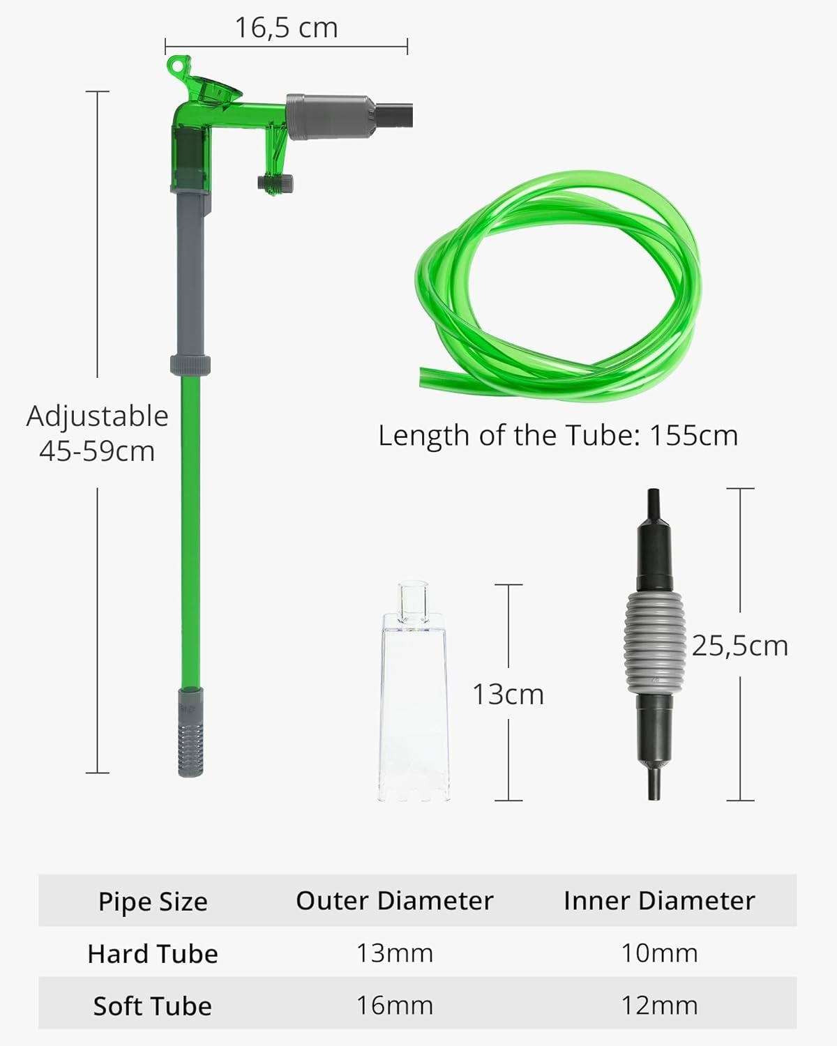 Состоит из гибкого шланга с насосом, что делает его практичным помощником при регулярной подмене воды. Вода легко всасывается нажатием на насос, что позволит эффективно и быстро завершить повседневную работу в аквариуме, сэкономив массу времени на чистку контейнера. Основание можно удобно чистить насадкой для чистки гравия/песка.