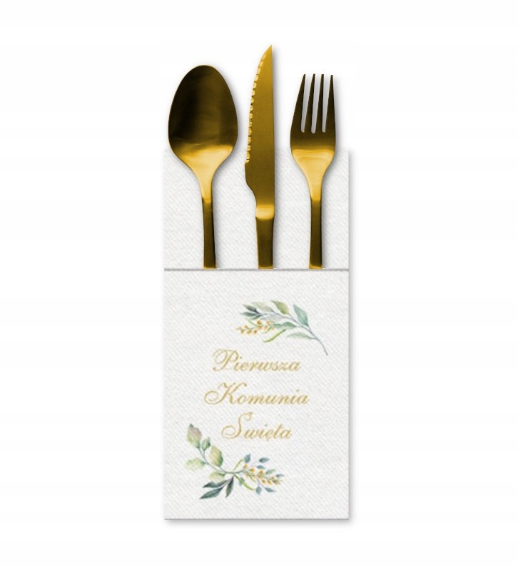 ✅ Салфетки для столовых приборов с принтом зеленых листьев и золотой надписью «Первое Святое Причастие» прекрасно подчеркнут характер церемонии.