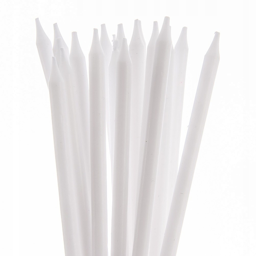 Набор из 12 длинных свечей для торта с подставками, обеспечивающими их устойчивость. Свечи белого цвета, длиной 14,5 см.