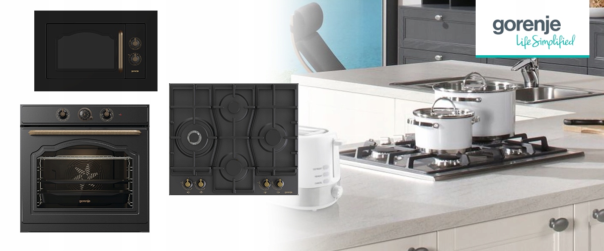 Стильный комплект Gorenje: электрическая духовка BOS67371CLB, газовая варочная панель GW6D42CLB и микроволновая печь BM235 CLB
