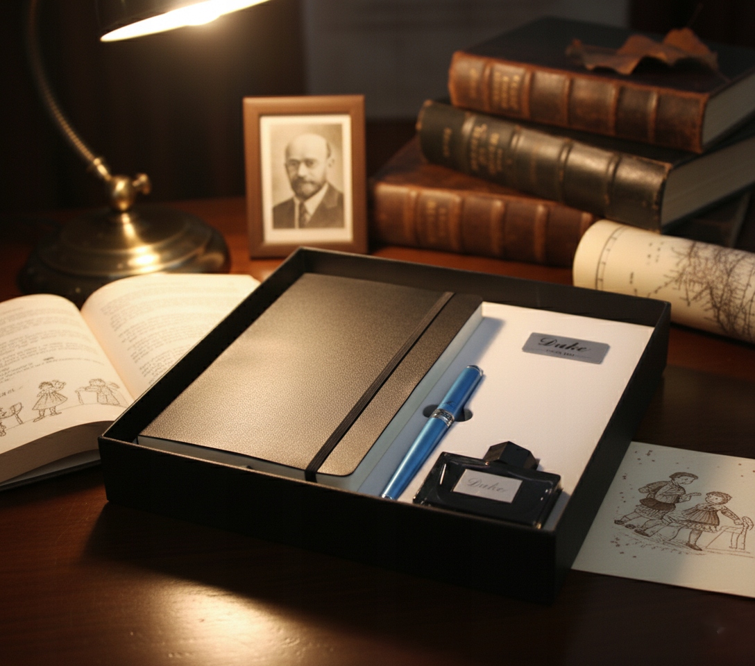 Этот набор – дань его наследию. Его центральным элементом является перьевая ручка – не только инструмент для письма, но и символ сочувствия, мудрости и преданности самым маленьким. Ее прочная конструкция и элегантный дизайн отражают силу и деликатность, которые Януш Корчак сочетал в своем подходе к воспитанию и уходу за детьми.