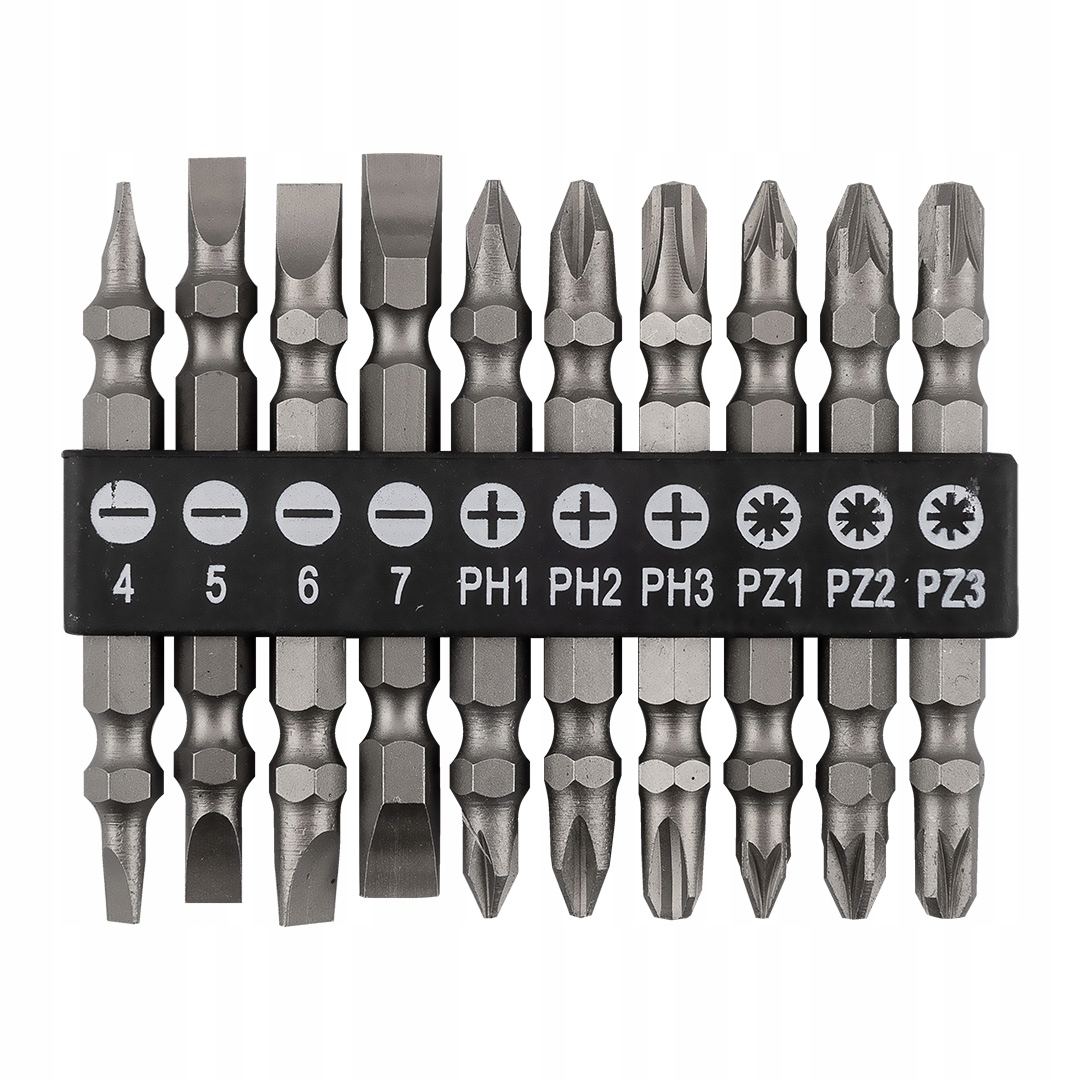 Набор двухсторонних бит SL4/5/6/7, PH1/2/3, PZ1/2/3 x 65 мм, 10 шт. 56T517 от GRAPHITE содержит 10 инструментов длиной 65 мм каждый. В набор входят двусторонние биты SL4, SL5, SL6, SL7, PH1, PH2, PH3, PZ1, PZ2 и PZ3. Все аксессуары имеют шестигранную ручку 1/4 дюйма и изготовлены из прочной хромованадиевой стали (CrV). Инструменты обеспечивают достаточную долговечность и устойчивость к износу при интенсивной работе. Они будут незаменимы в оснащении каждого любителя DIY.