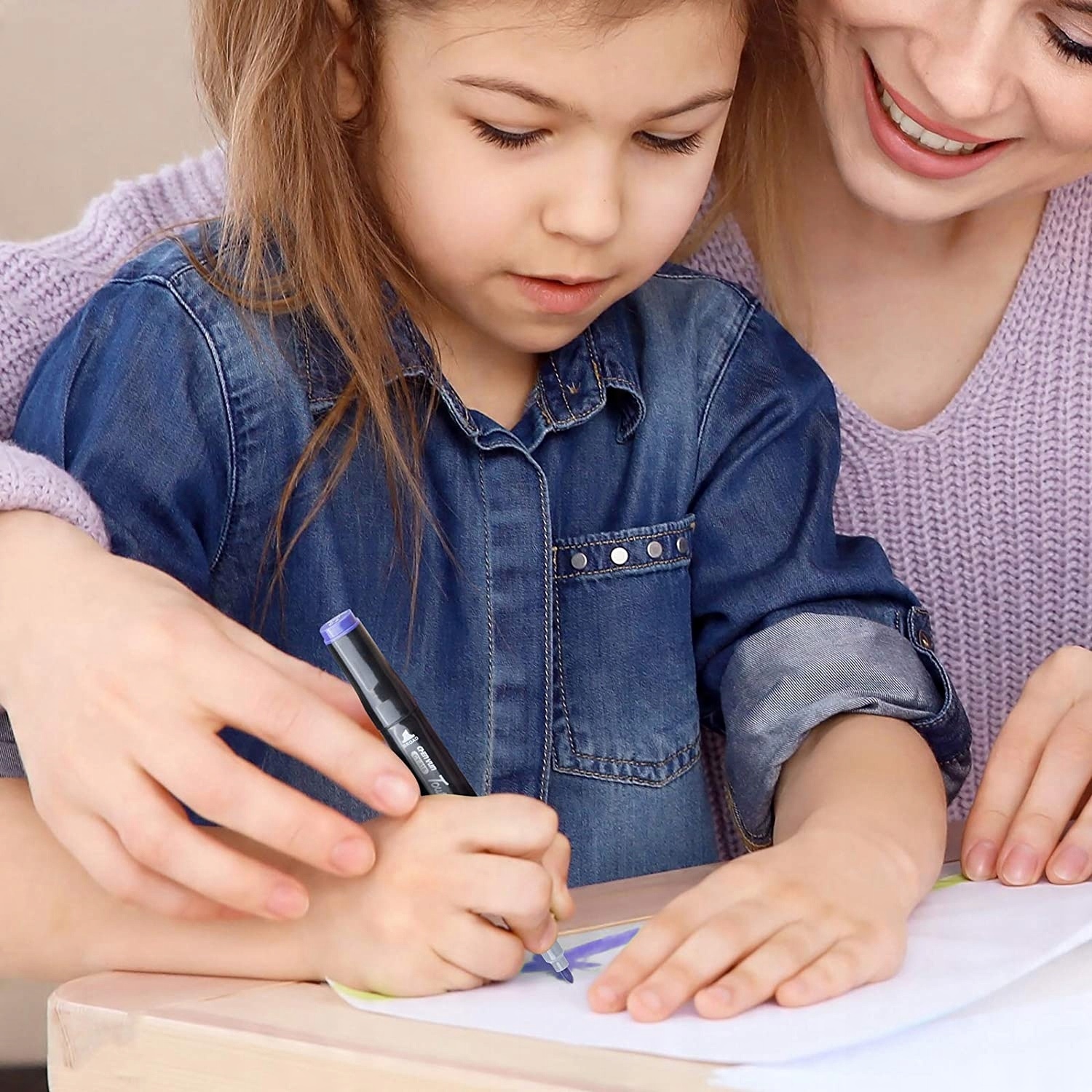 Ручки имеют два разных эффективных наконечника, что значительно упрощает их использование. Один из кончиков круглый и идеально подходит для более узких линий, письма или выделения. Второй наклонен и позволяет быстрее рисовать более толстые линии, раскрашивать и выделять