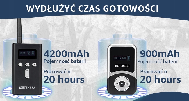 - Передатчик имеет батарею 4200 мАч, а приемник использует батарею 900 мАч, его можно непрерывно использовать в течение 20 часов.