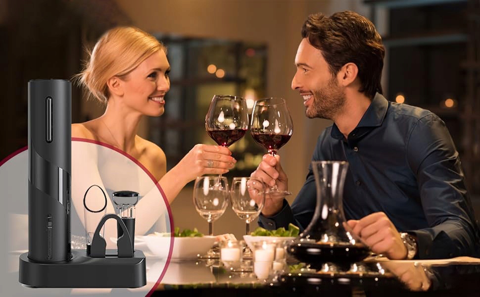 После полной зарядки открывателя для электрического бутылки он может непрерывно открывать 40 бутылок. Разбор бутылок с аккумуляторами удаляет пробки в течение 5-7 секунд, нажимая кнопки «вниз» и «вверх». Этот набор открывателей для бутылок позволяет легко открывать винные бутылки и легко налить вино.