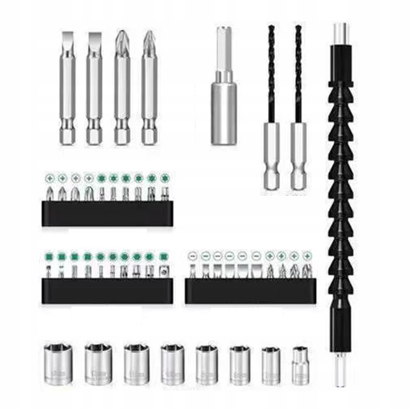 4. Универсальный комплект: В этот комплект входят 4 длинных, 10 коротких, 2 спиральных сверла, 1 шатун, 1 гибкий вал и 8 шестигранных головок, что обеспечивает широкий выбор вариантов для различных применений.
