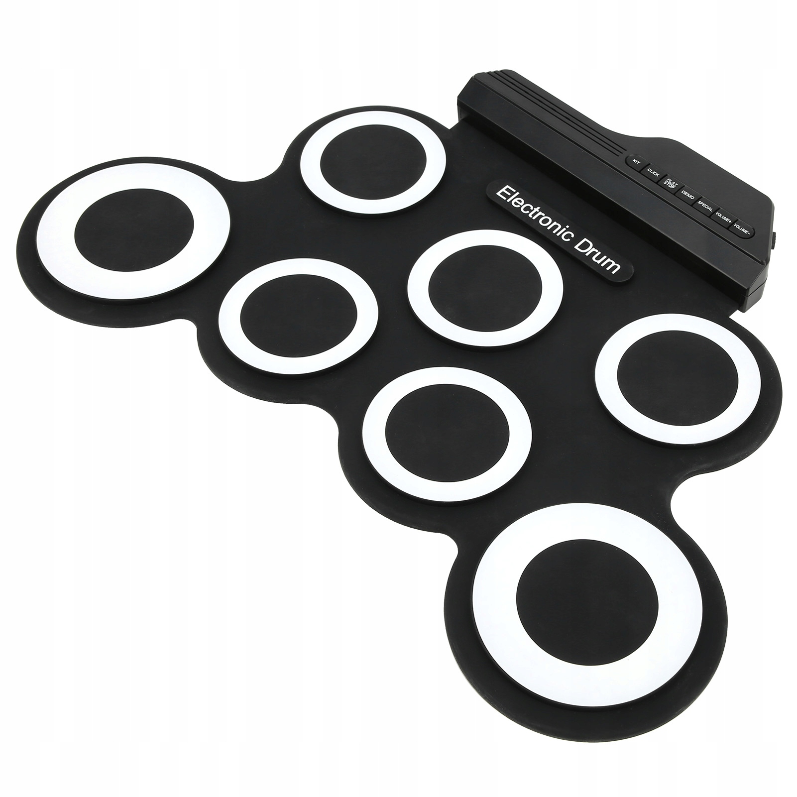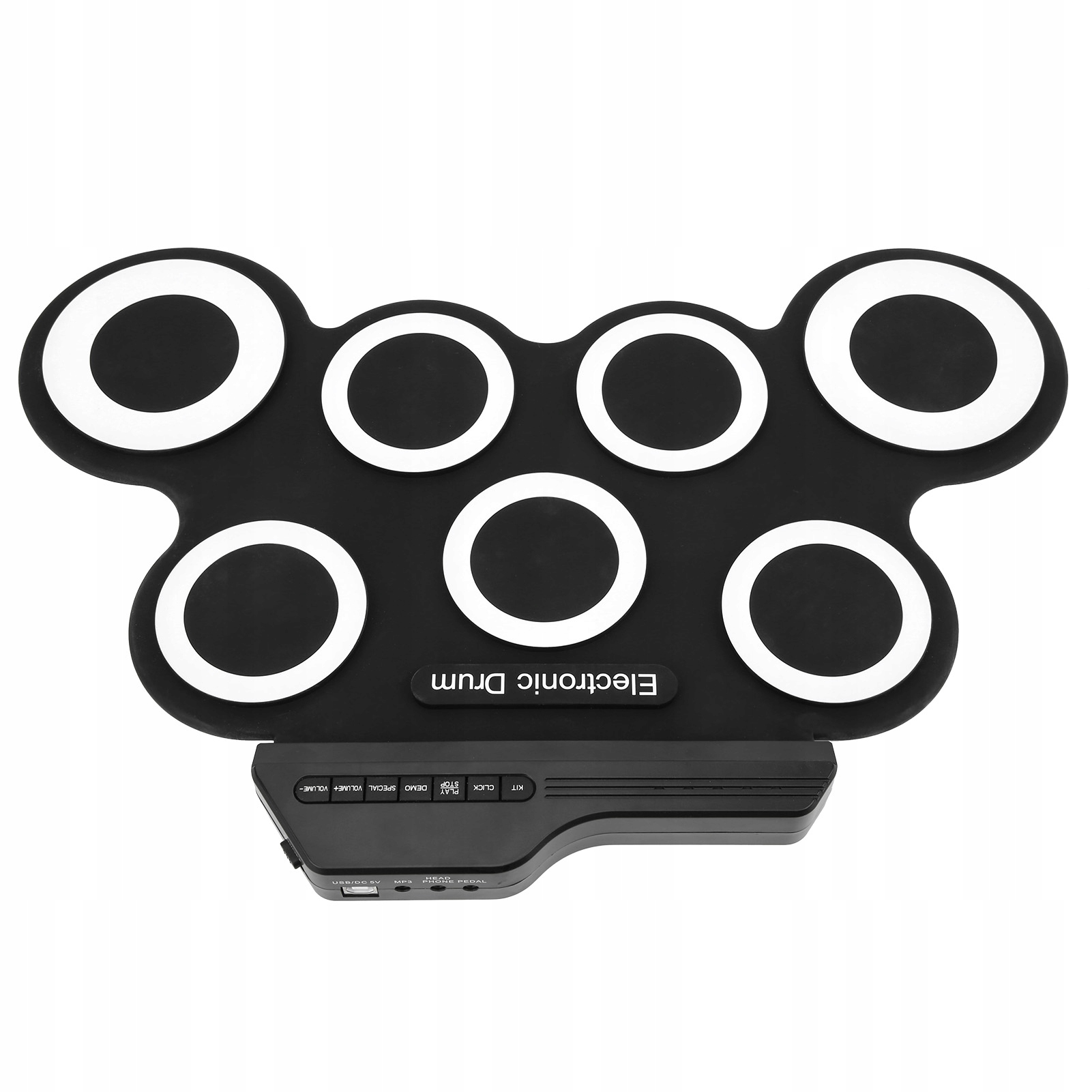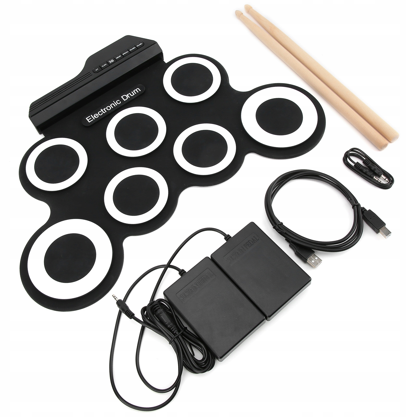 - Особенности: портативный электронный барабан с двойной педалью и 2 барабанными палочками.