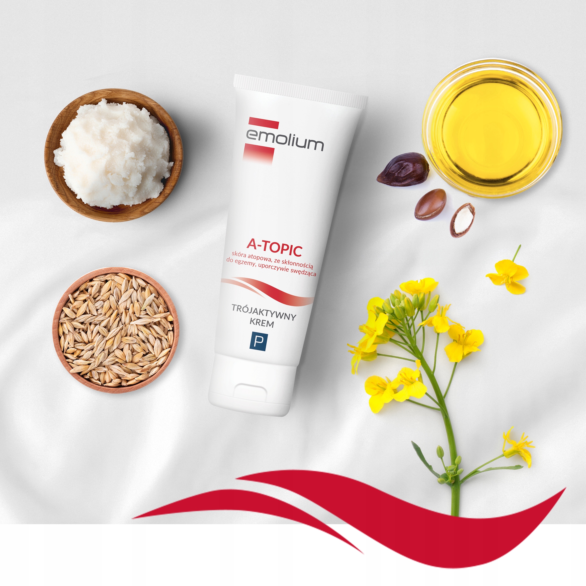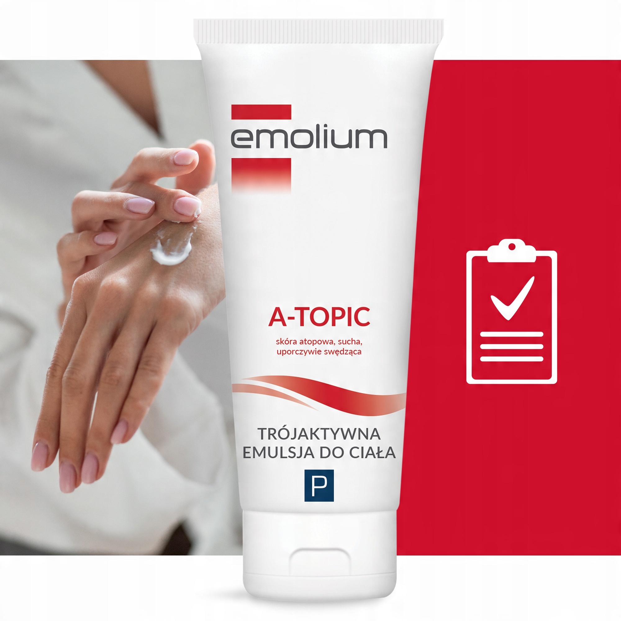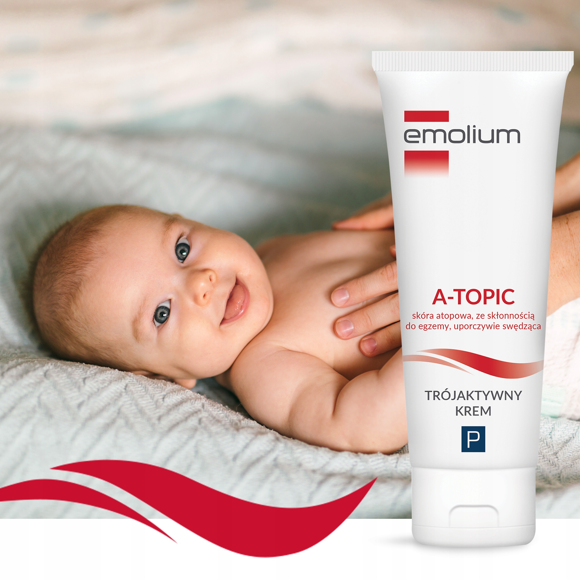 Эмолиум A-topic Мы создали триактивную эмульсию для тела специально для ежедневных потребностей сухой, атопичной и постоянно зудящей кожи с первого месяца жизни. Эмульсия успокаивает и снимает ощущение зуда, увлажняя и восполняя липиды.