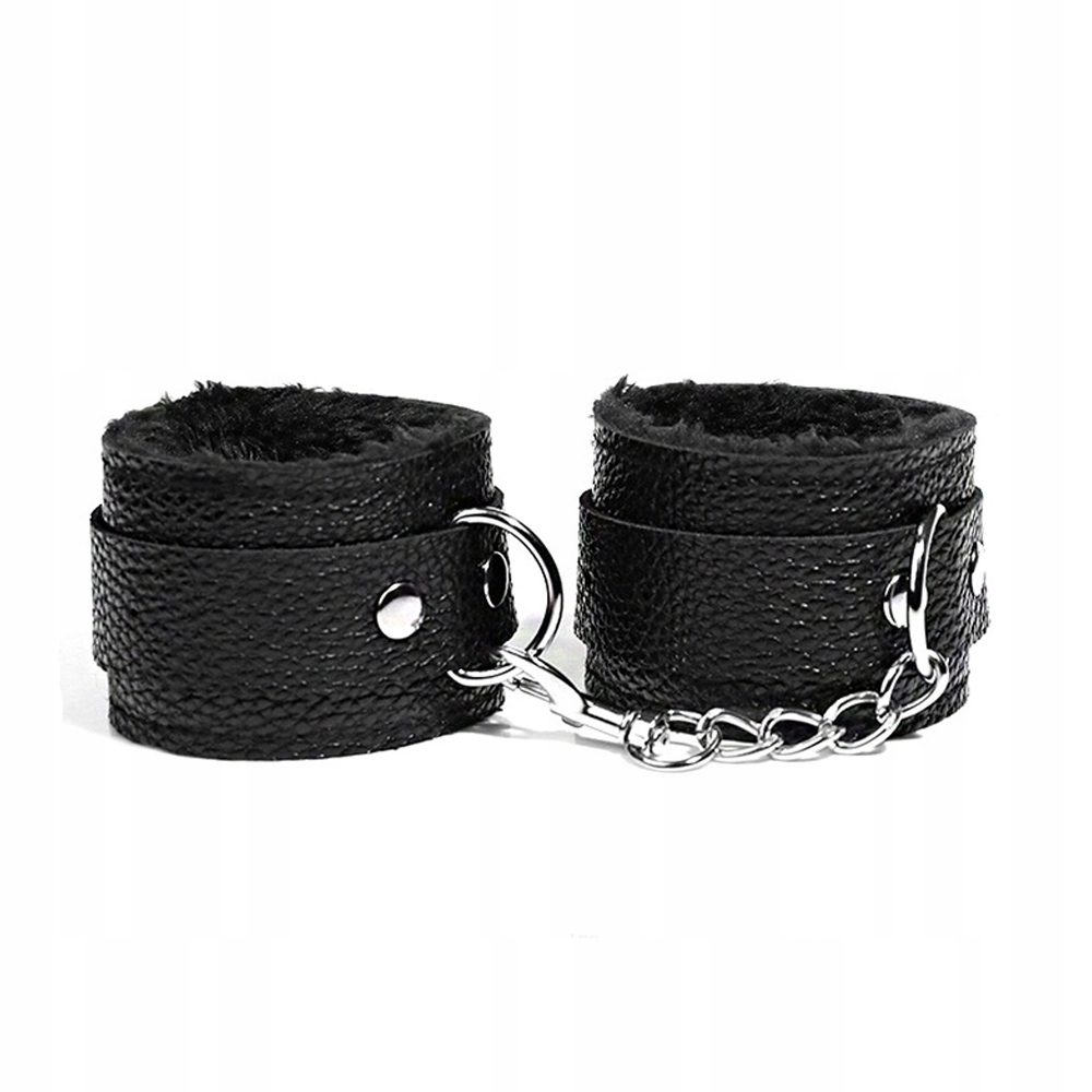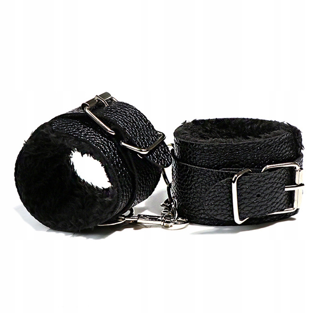 Богатый набор выполнен из искусственной кожи. Наручники цельные и покрыты плюшем, что исключает риск потертостей.