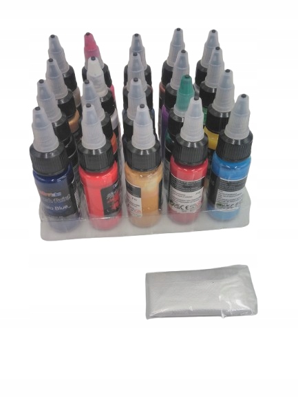 - Аэрограф краски в наборе из 20 цветов, в том числе 14 стандартных цветов: синий свет, желтый свет, синий малиб, красный, ультрамарин, розовый, желтый, зеленый, круглый, розовый, белый, фиолетовый, красный апельсин, черный.