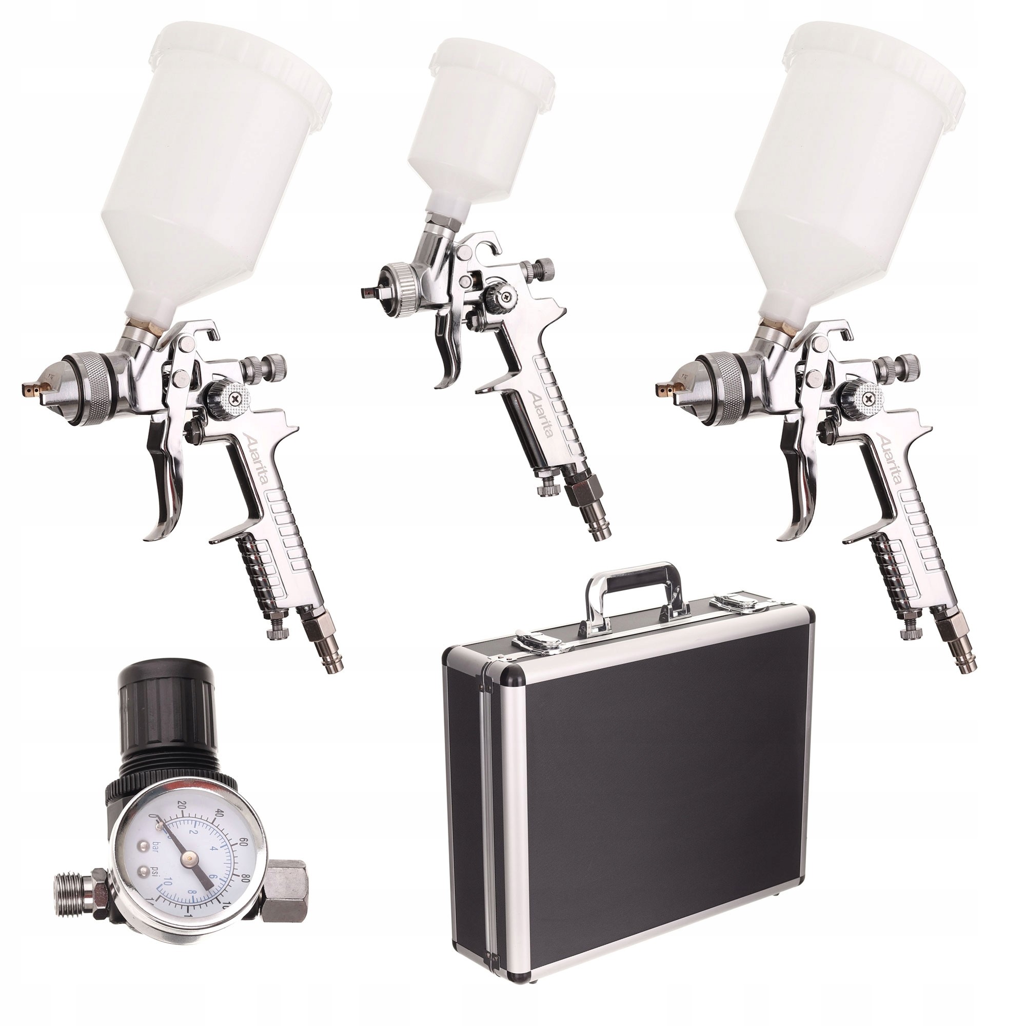 Профессиональный набор покрасочных пистолетов, изготовленный по технологии HVLP (High Volume Low Pressure), работающей при низком давлении, что значительно снижает потери материала при покраске по сравнению с технологией HP. оружие.