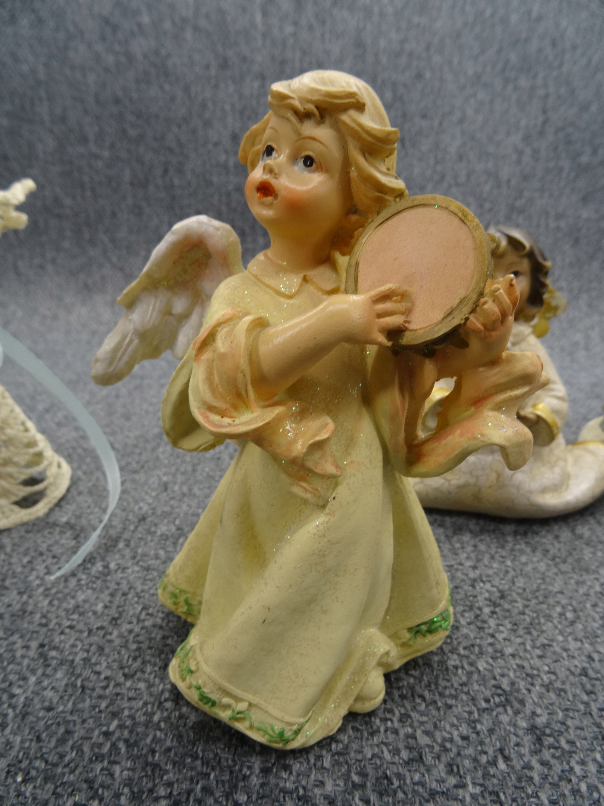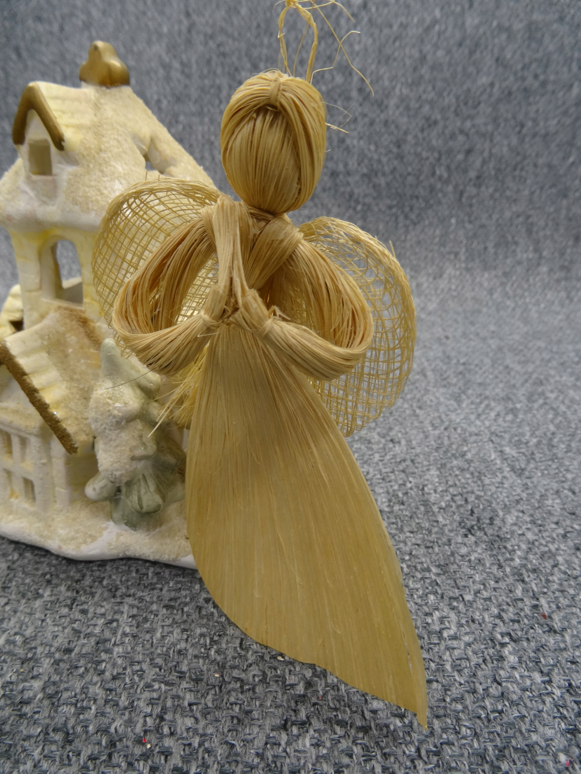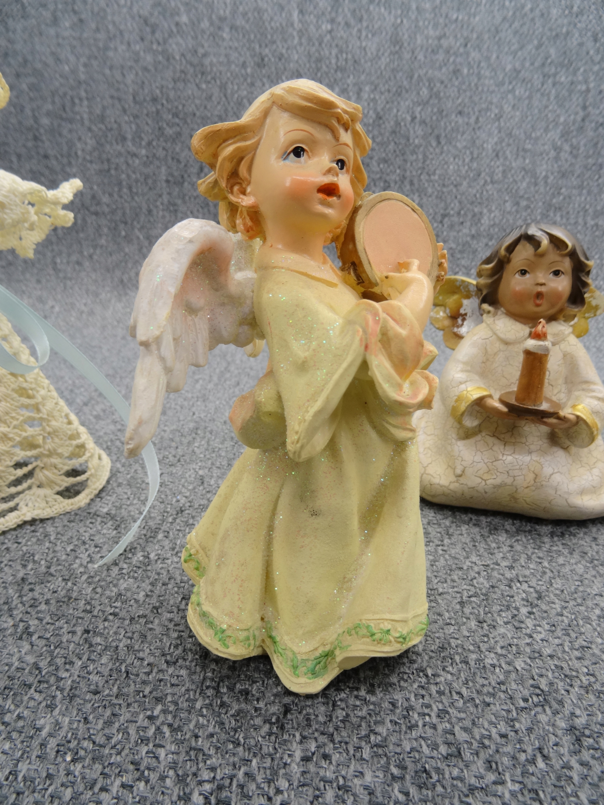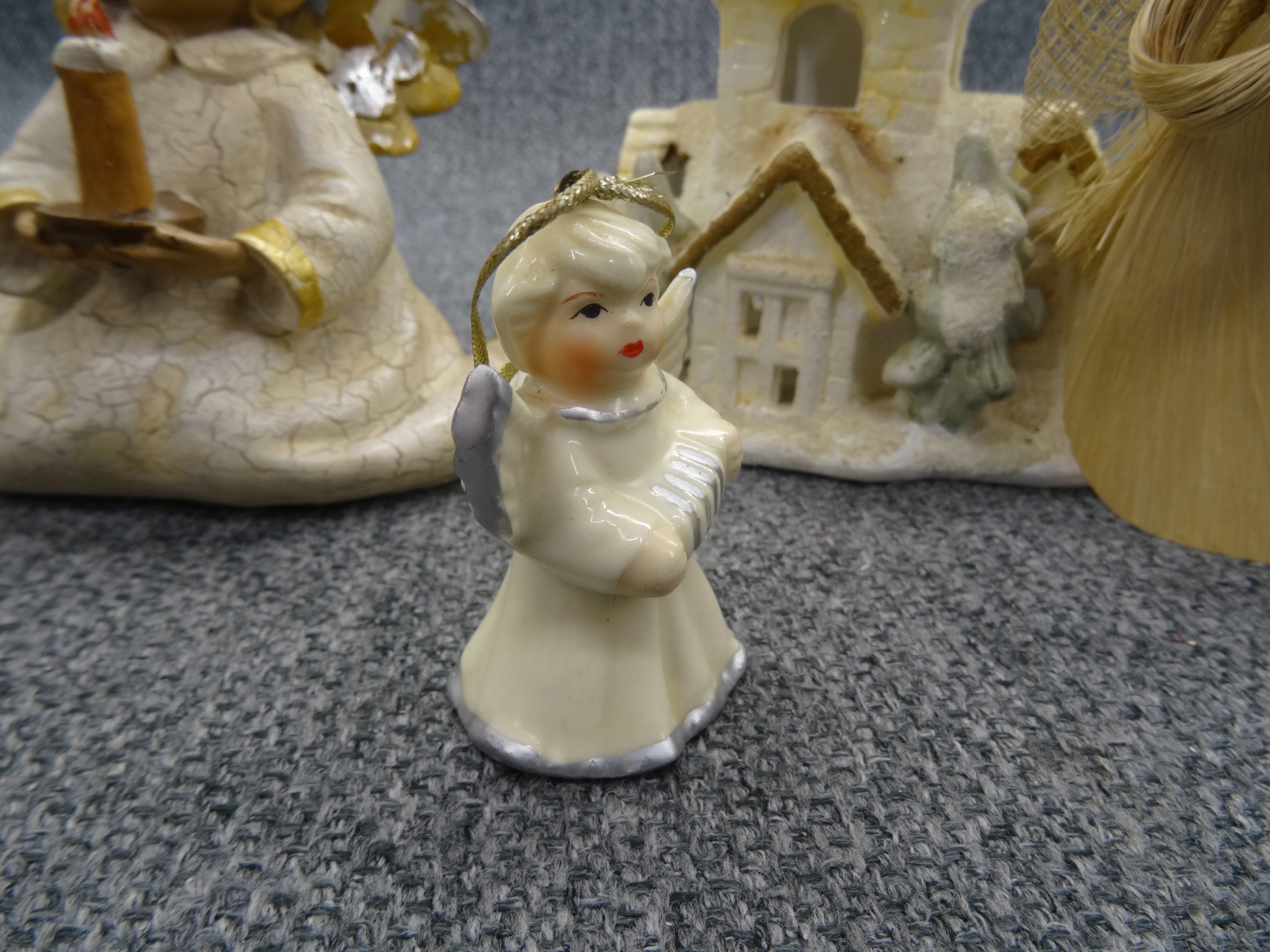 Набор из 6 фигурок с ангелочками и домиком с подсвечником. Статуэтки из керамики, пластика, льна, ангел, связанный крючком из хлопчатобумажной нити, накрахмаленной для сохранения формы.