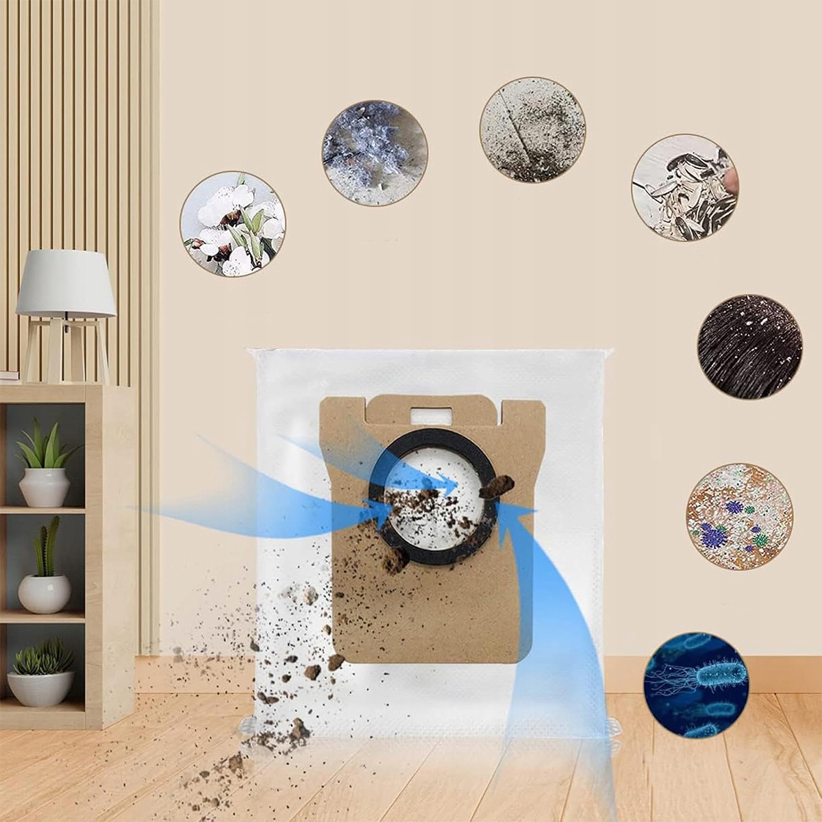 【Мешок для пыли】Мешок состоит из двух слоев выдувных из расплава волокон и двух слоев нетканого материала. Четырехслойная система фильтров работает вместе с очистительной станцией и эффективно улавливает 99% частиц пыли.