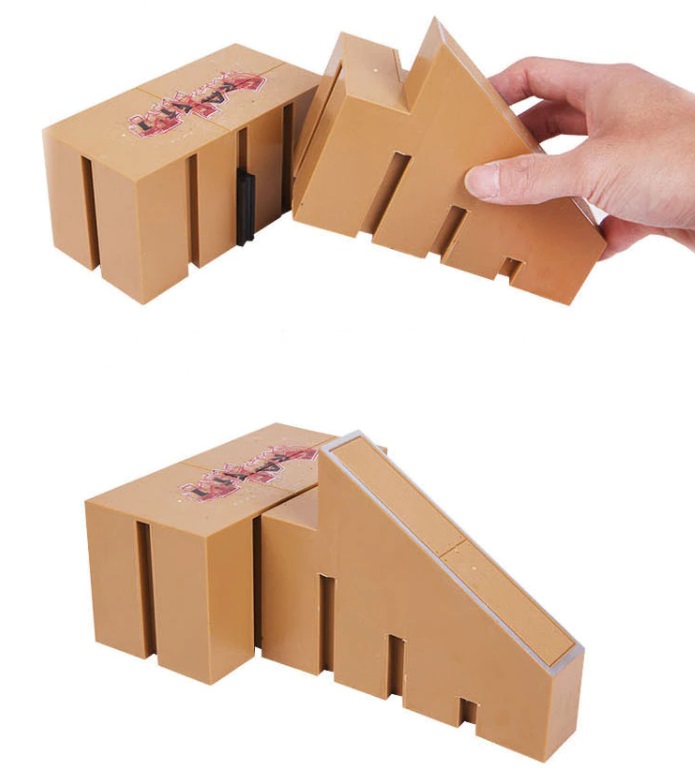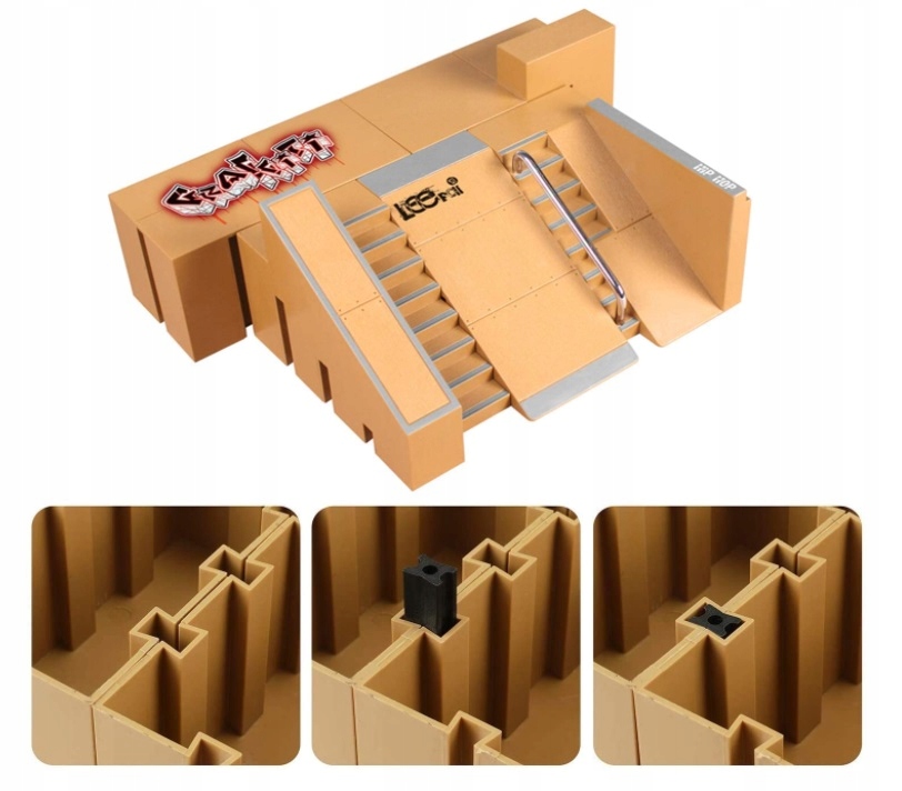 Входящий в комплект скейт-парк состоит из 5 различных модулей, изготовленных из высококачественного пластика. Собрать любую конфигурацию очень просто — просто используйте прилагаемые пластиковые соединители и вставьте их в направляющие, встроенные в сегменты, а затем соедините модули. Разъемы различаются по длине в зависимости от того, куда они подходят.