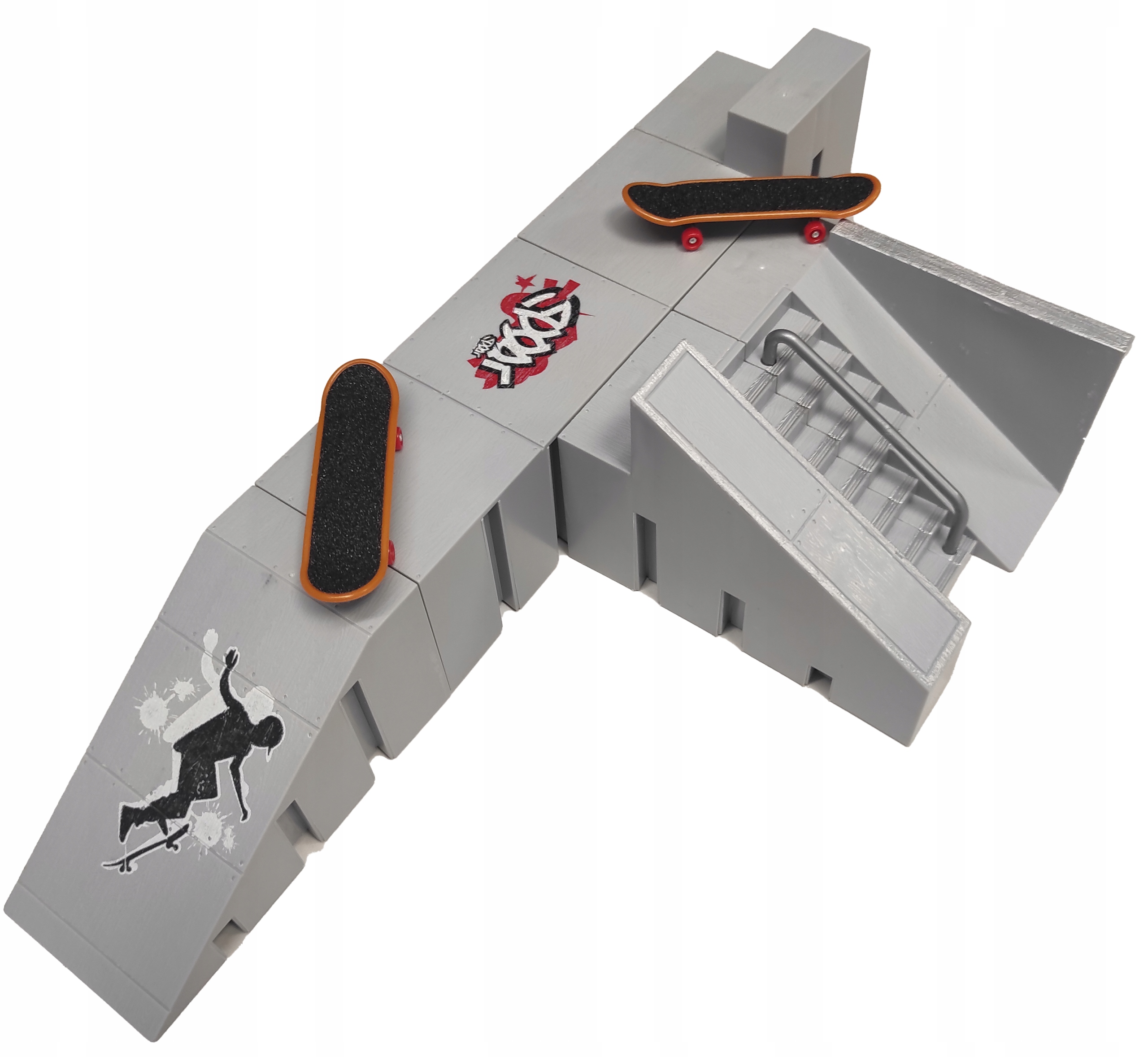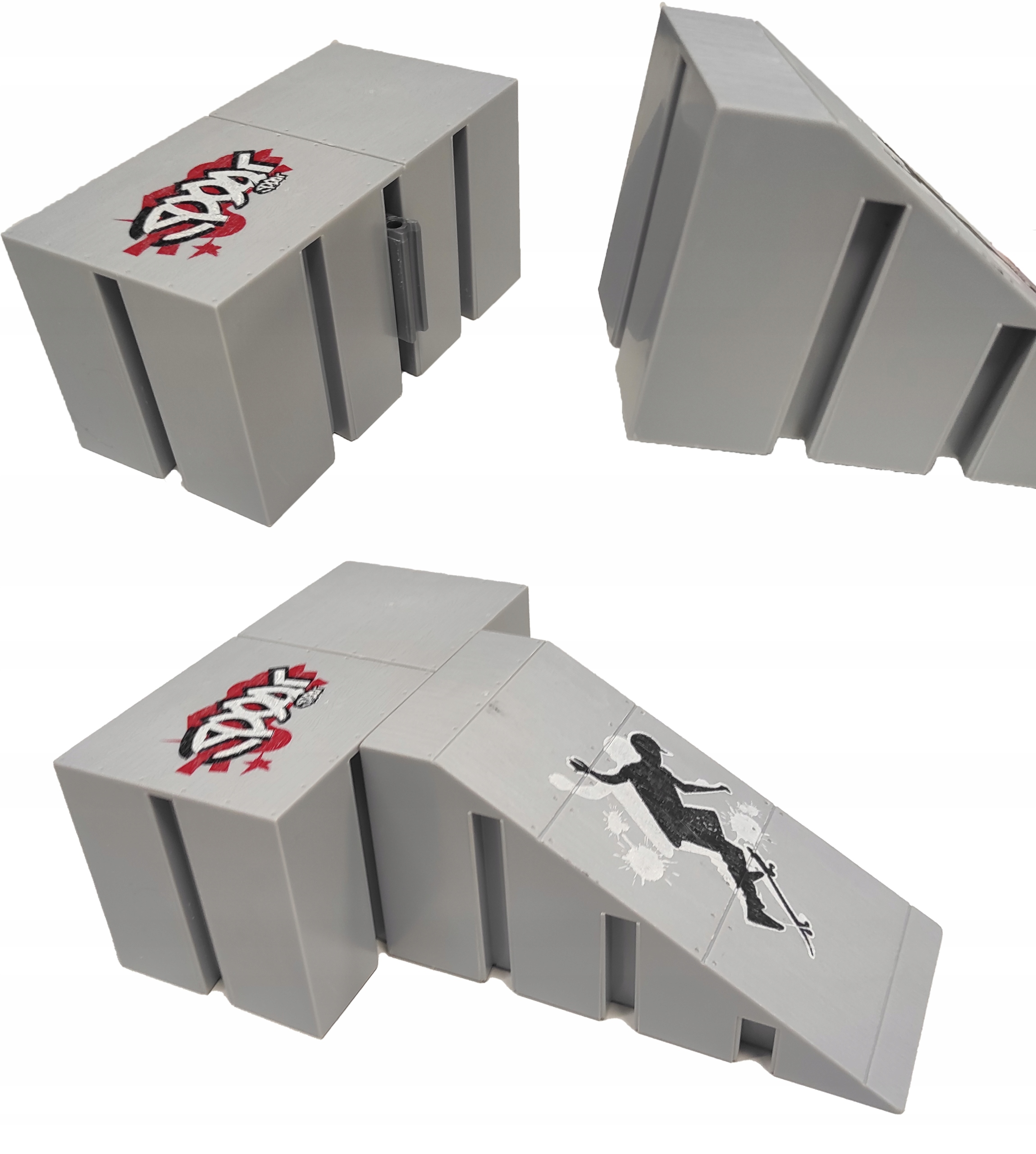 Входящий в комплект скейт-парк состоит из 5 различных модулей, изготовленных из высококачественного пластика. Собрать любую конфигурацию очень просто — просто используйте прилагаемые пластиковые соединители и вставьте их в направляющие, встроенные в сегменты, а затем соедините модули. Разъемы различаются по длине в зависимости от того, куда они подходят.