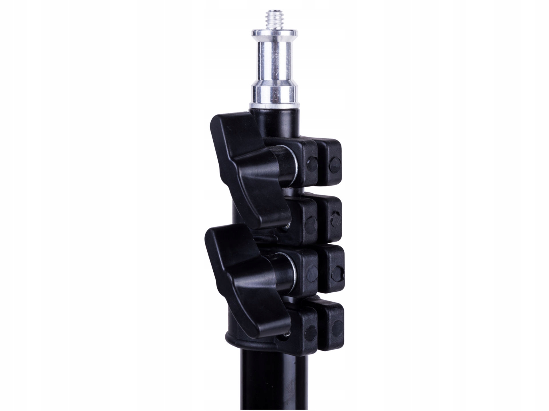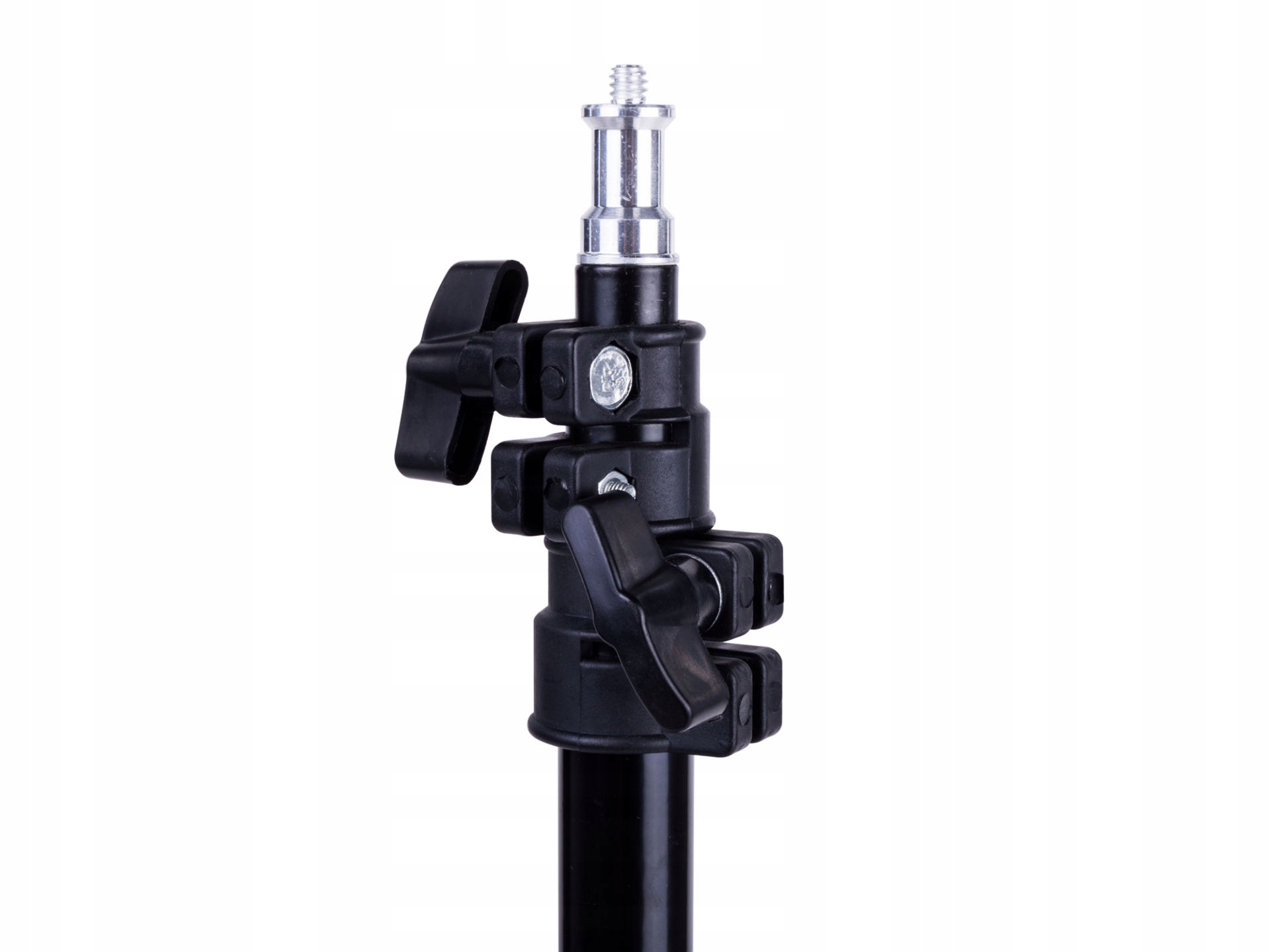 Стойка имеет универсальное крепление (так называемая грибовидная головка), позволяющее использовать широкий спектр студийных аксессуаров и светильников различных производителей.