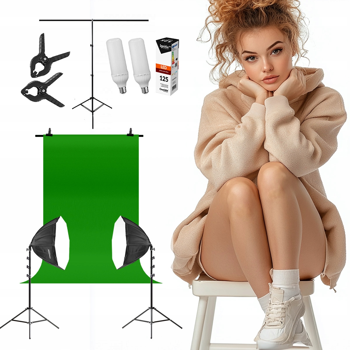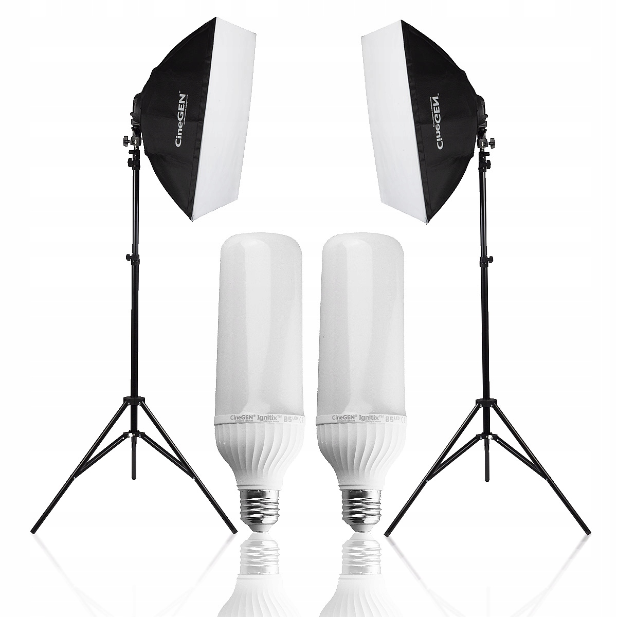 Освещение, используемое в наборе, представляет собой классическую студийную непрерывное освещение - одиночные светильники Softbox на штативах освещения. Softboxs оснащены светодиодными лампами серии Ignitix ™ со стандартными параметрами ( Цветовая температура 5500K и Коэффициент воспроизведения цвета CRI> 90 ). Softboxes является основным элементом фотостудии. Они успокаивают тональные переходы между светом и тенью. Свет равномерно распределяется внутри софтбокса и сохраняет ту же мощность по всей поверхности диффузора. Снаружи Softbox тусклый черный, благодаря которого он не отражает свет других ламп. Складывание и склад очень просты, а сложная софтбока занимает мало места. Высокое качество материалов, из которых софтбокс делается гарантированием, без проблем, работающих за невыполнениями.