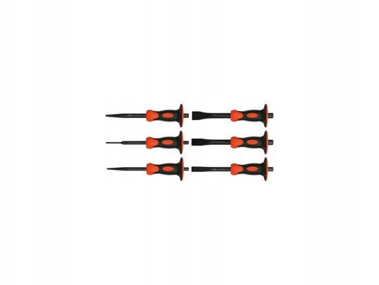 Набор из шести слесарных инструментов из CrV стали в чехле для транспортировки и хранения. В комплект входят три плоских стамески 13х10х180 мм, 16х13х180 мм, 19х13х180 мм, пробойник цилиндрический 3х180 мм, пробойник конический 3х180 мм и кернер 4х180 мм. Инструменты из хромованадиевой стали с крышками, защищающими руку от случайных ударов. Поверхность инструментов чернеют. Набор мастерских инструментов для работы с металлом. Для резки, штамповки и надрезания.