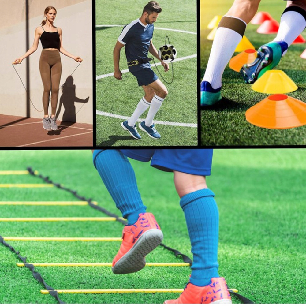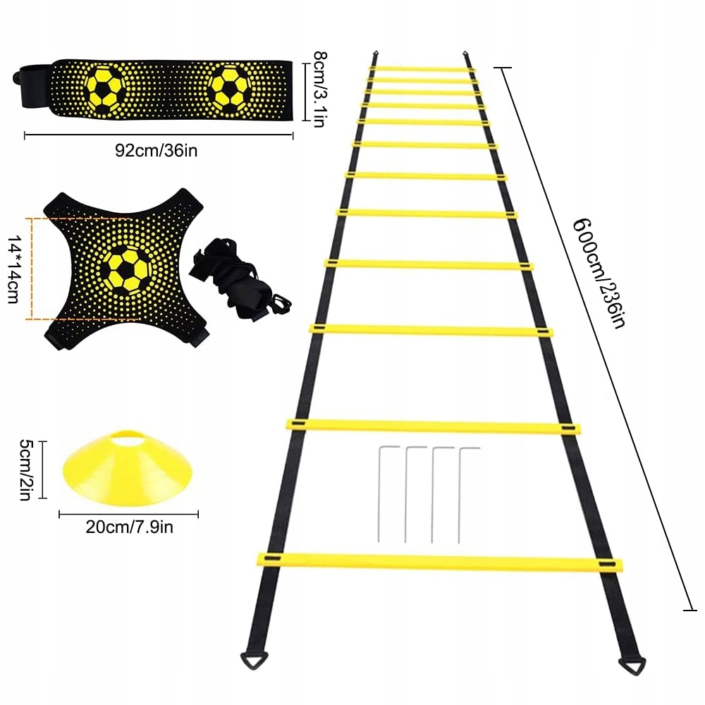 Упражнения для работы ног, улучшающие футбольные навыки, это комплексное устройство для футбольных тренировок. В каждый комплект входит 6-метровая лестница с 12 перекладинами, 12 футбольных конусов (6 желтых, 6 оранжевых), 1 футбольный тренажер для ударов ногами, 4 стальных колышка для дополнительной устойчивости и сумка для переноски.