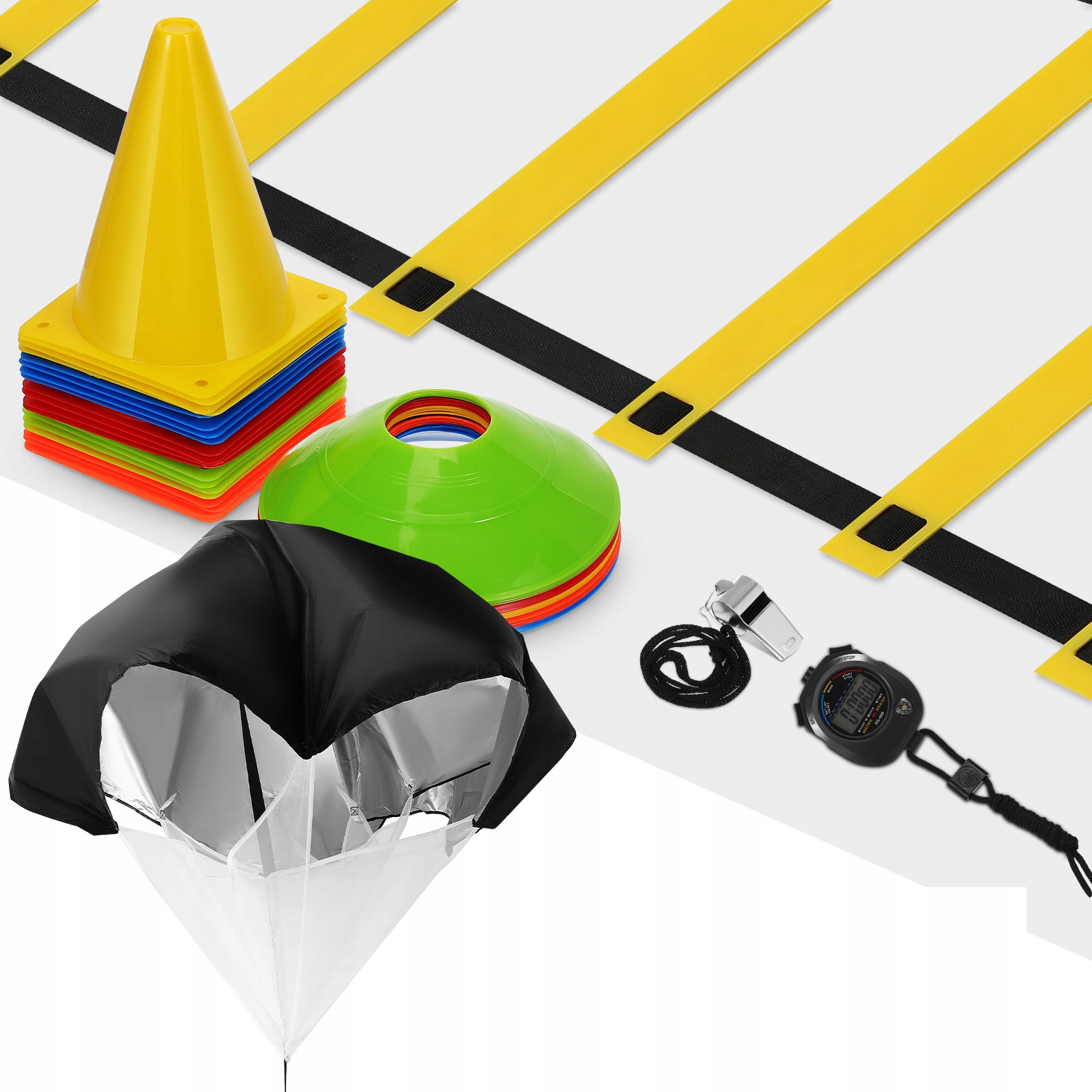 В комплект входят 20-футовая лестница для ловкости, дисковые конусы, конусы повышенной видимости, парашют с сопротивлением, секундомер и свисток.