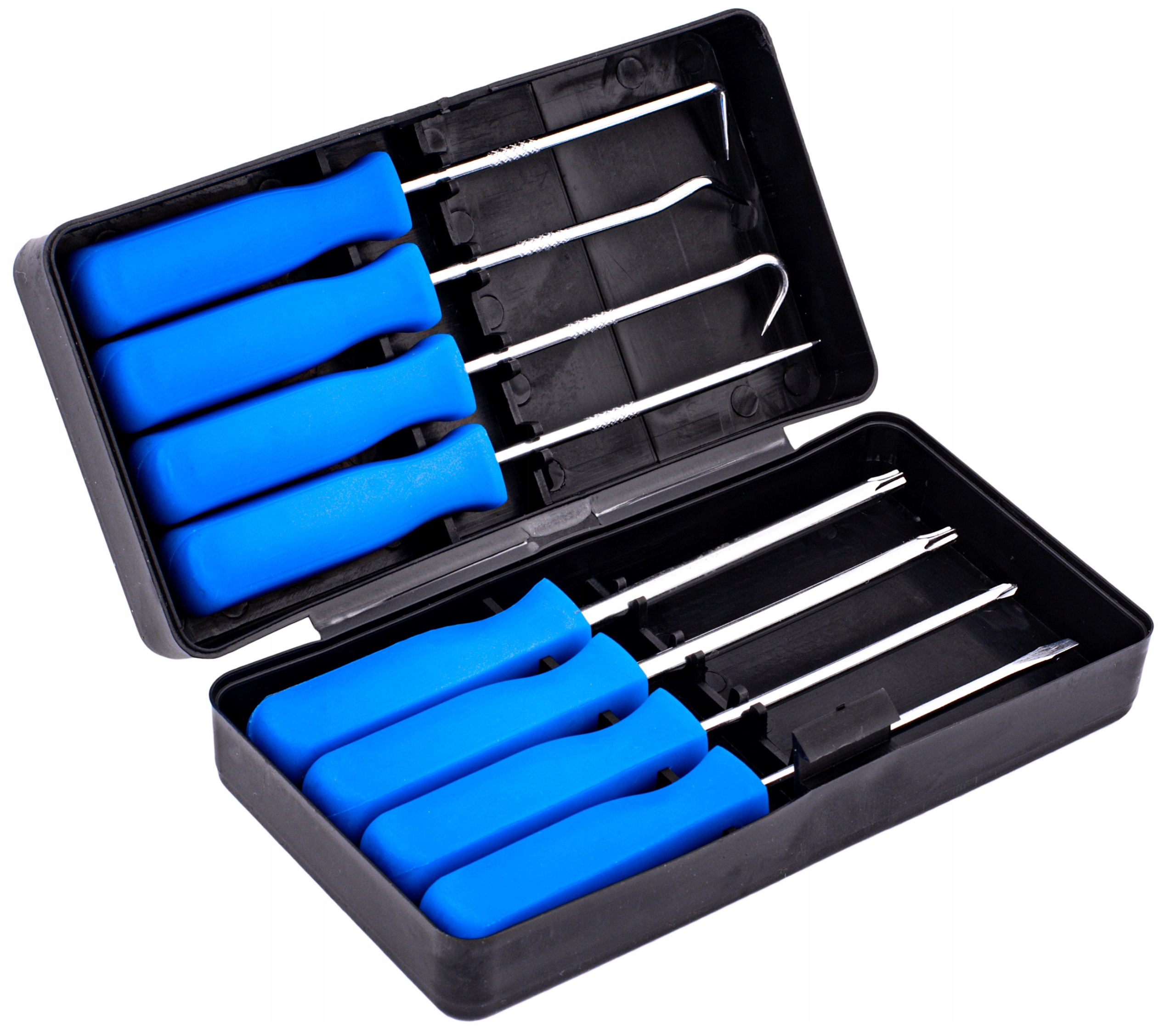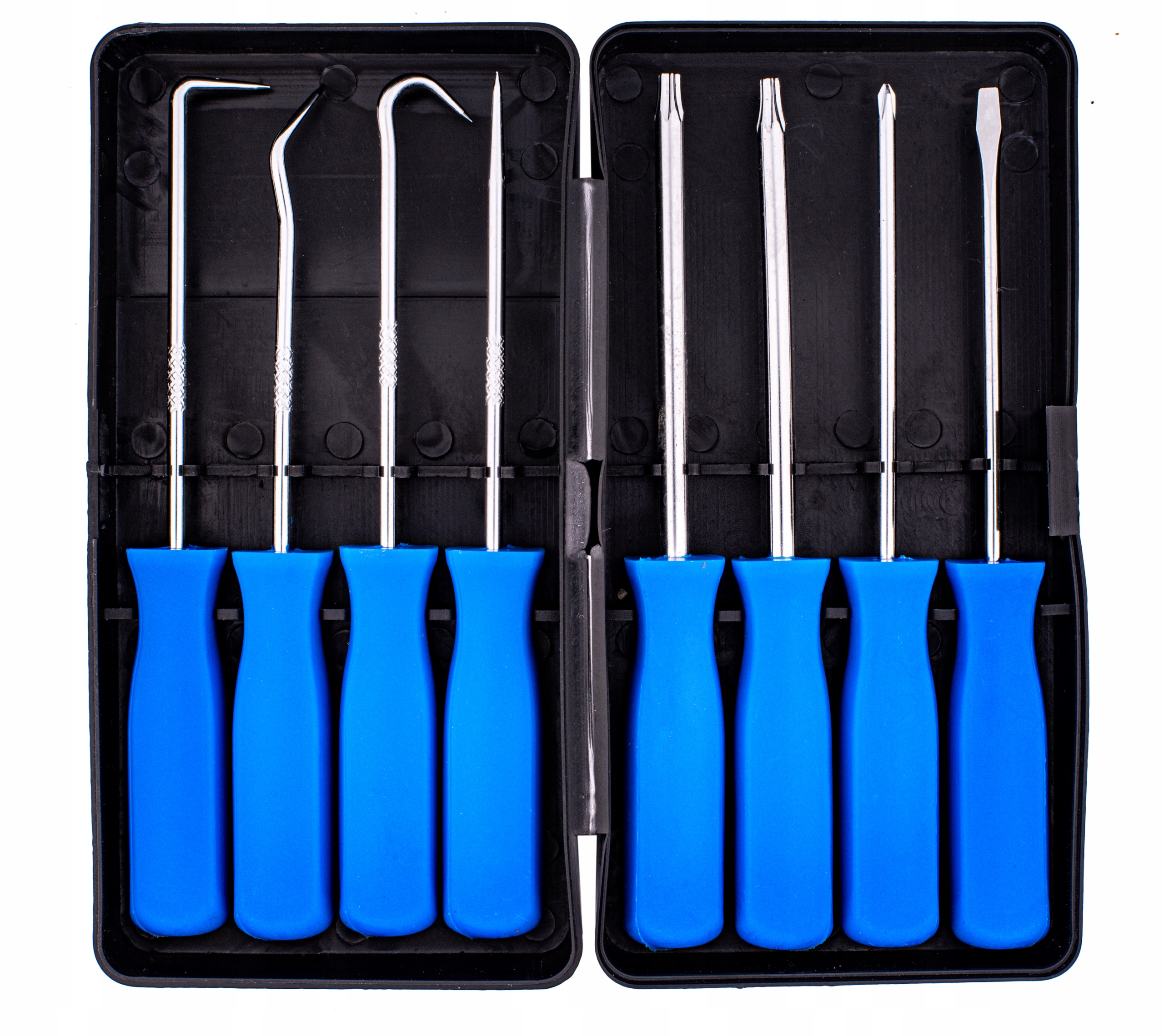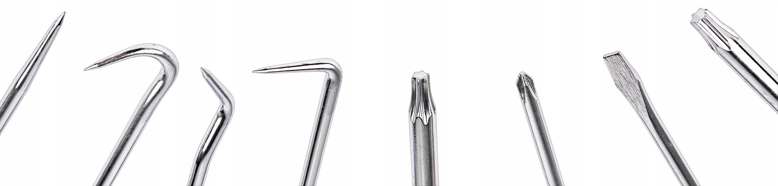 Набор из 8 крючков и отверток с ручкой. Крюки имеют смягченные и хромированные пещеры. Ручка изготовлена из высококачественного материала.