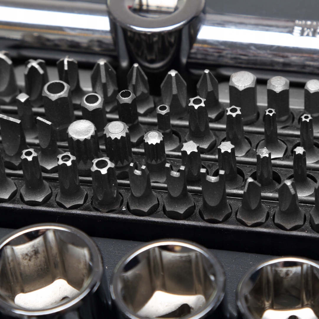 Набор из 217 гаечных ключей размером 1/4", 3/8" и 1/2", диапазоном 3,5-32 мм, изготовленных из CrV стали. Розетки хромированы и отполированы, ключи поставляются в пластиковом кейсе. В комплект также входят комбинированные ключи, торцевые головки трех размеров и три рукоятки с храповым механизмом.