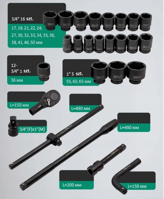 - Головки 3/4" 6-гранные - 17 шт. 17 мм, 19 мм, 21 мм , 22 мм, 24 мм, 27 мм, 30 мм, 32 мм, 33 мм, 34 мм, 35 мм, 36 мм,(36 мм - 12-угольный), 38 мм, 41 мм, 46 мм, 50 мм <; /li>