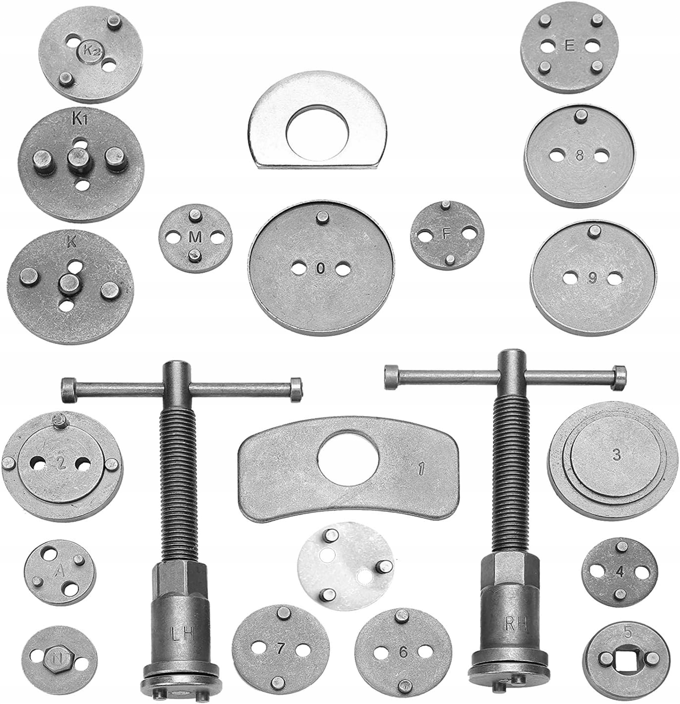 Содержит все необходимое для эффективного втягивания тормозных поршней. В комплект входит пресс с двусторонней резьбой (для правосторонних и левосторонних поршней) и 18 переходников, подходящих к большинству марок и моделей автомобилей, представленных на рынке.