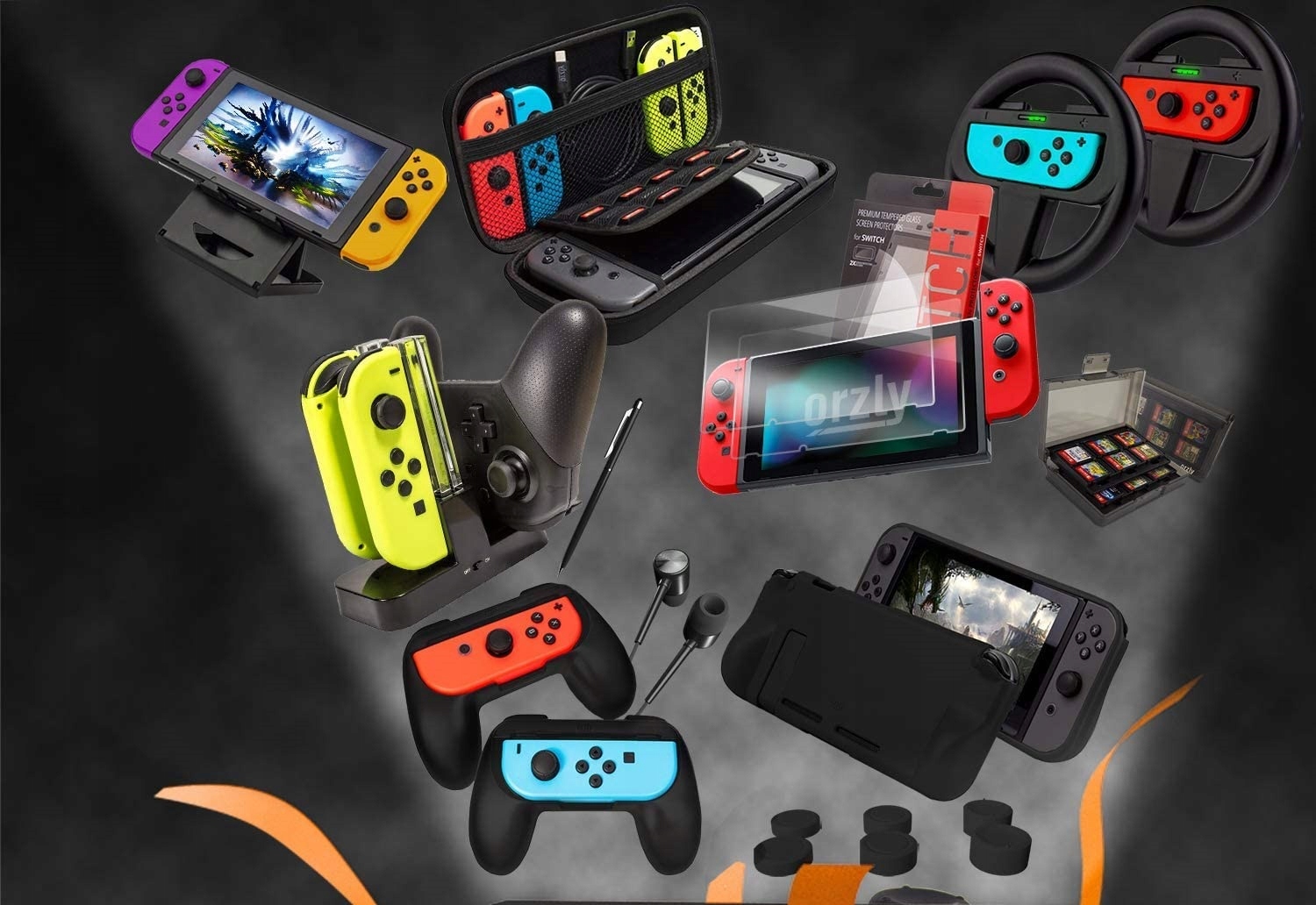 Набор аксессуаров Orzly Geek Pack, совместимый с Nintendo Switch — чехол — защитная пленка для экрана — ручки Joycon — гоночные рули — зарядная станция контроллера — чехол — черный — JetBlack