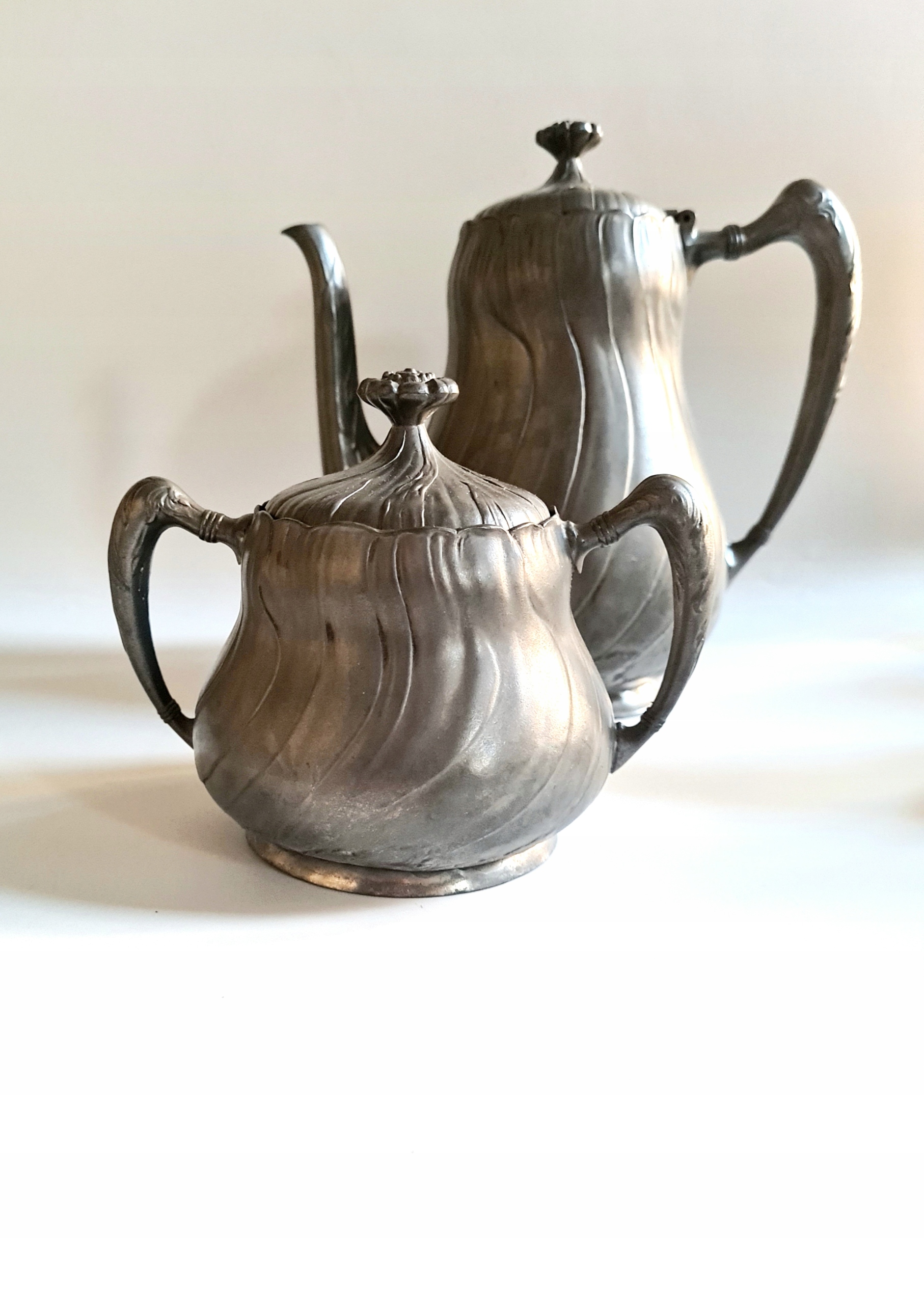 Красивый жестяной сервиз, так называемый центр стола: кувшин, сахарница и молочник. Все выдержано в стиле модерн, модерн или знаменитом стиле модерн. Каждый предмет выполнен в форме цветка, благодаря чему он приобретает динамичную форму, но в то же время очень ажурен по своей органичной форме.