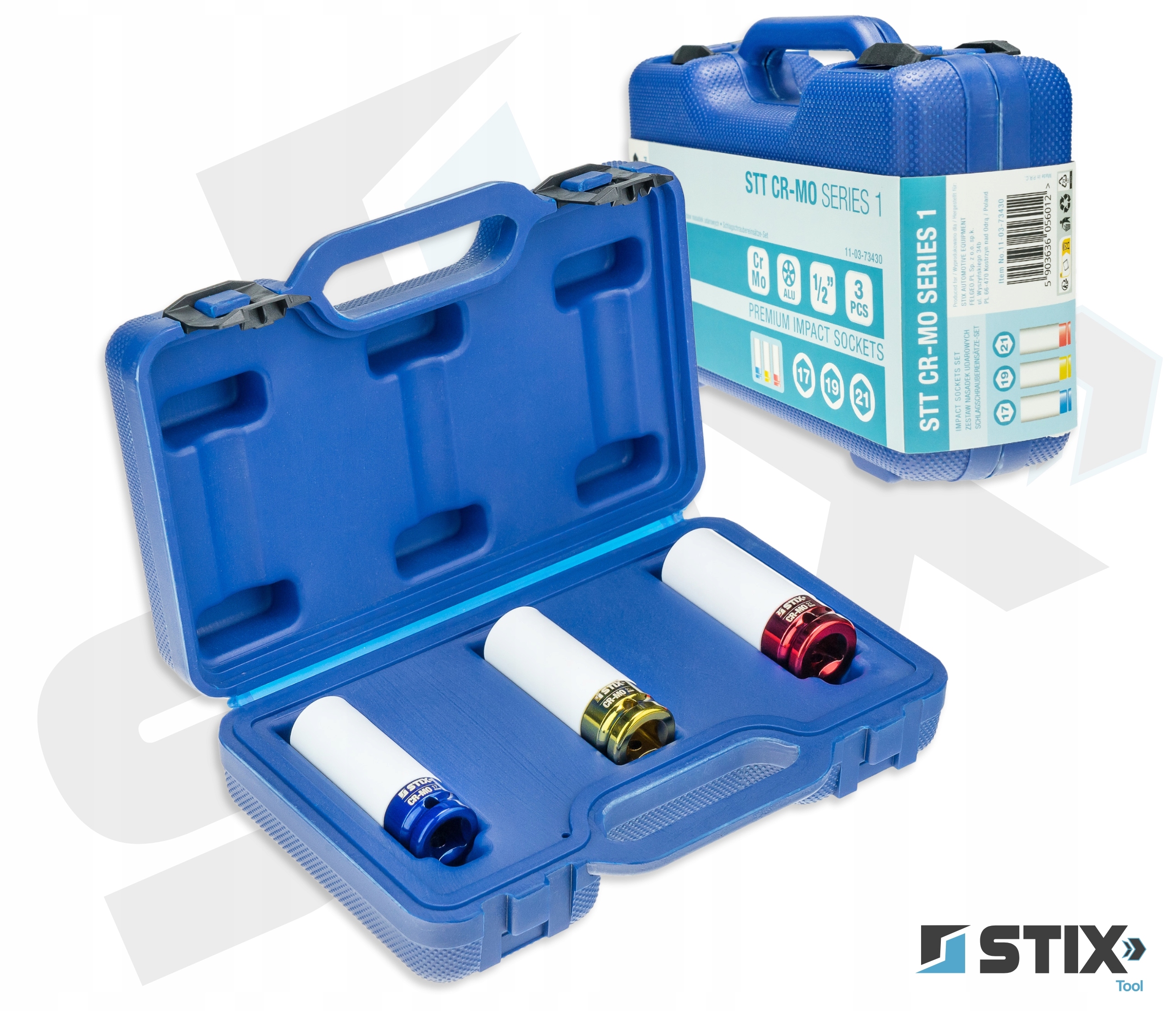 STT Series 1 от Stix Tool — набор из трёх длинных ударных головок (79 мм), предназначенных для откручивания и затягивания болтов и гаек крепления алюминиевых дисков. Благодаря использованию пластиковых крышек и внутренних защитных вставок они обеспечивают безопасность как обода, так и поверхности гайки. Изготовлен из хромомолибденовой стали, упакован в практичный чемодан.