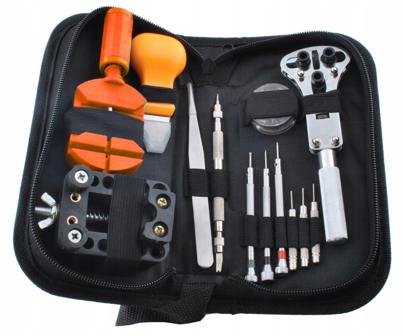 Набор инструментов для ремонта упакован в очень практичный кейс (типа пенала) на молнии. В корпусе имеется удобный ремень, с помощью которого можно легко и безопасно транспортировать часовой набор. Ремонтный комплект можно держать в руке или надежно повесить на запястье. Внутри кейса каждому инструменту отведено свое место, поэтому они не теряются, не перемешиваются и не ударяются друг о друга, обеспечивая при этом легкий доступ к необходимому аксессуару без необходимости его искать. К каждому инструменту в наборе часовщика можно легко добраться одной рукой (например, держать часы в другой).